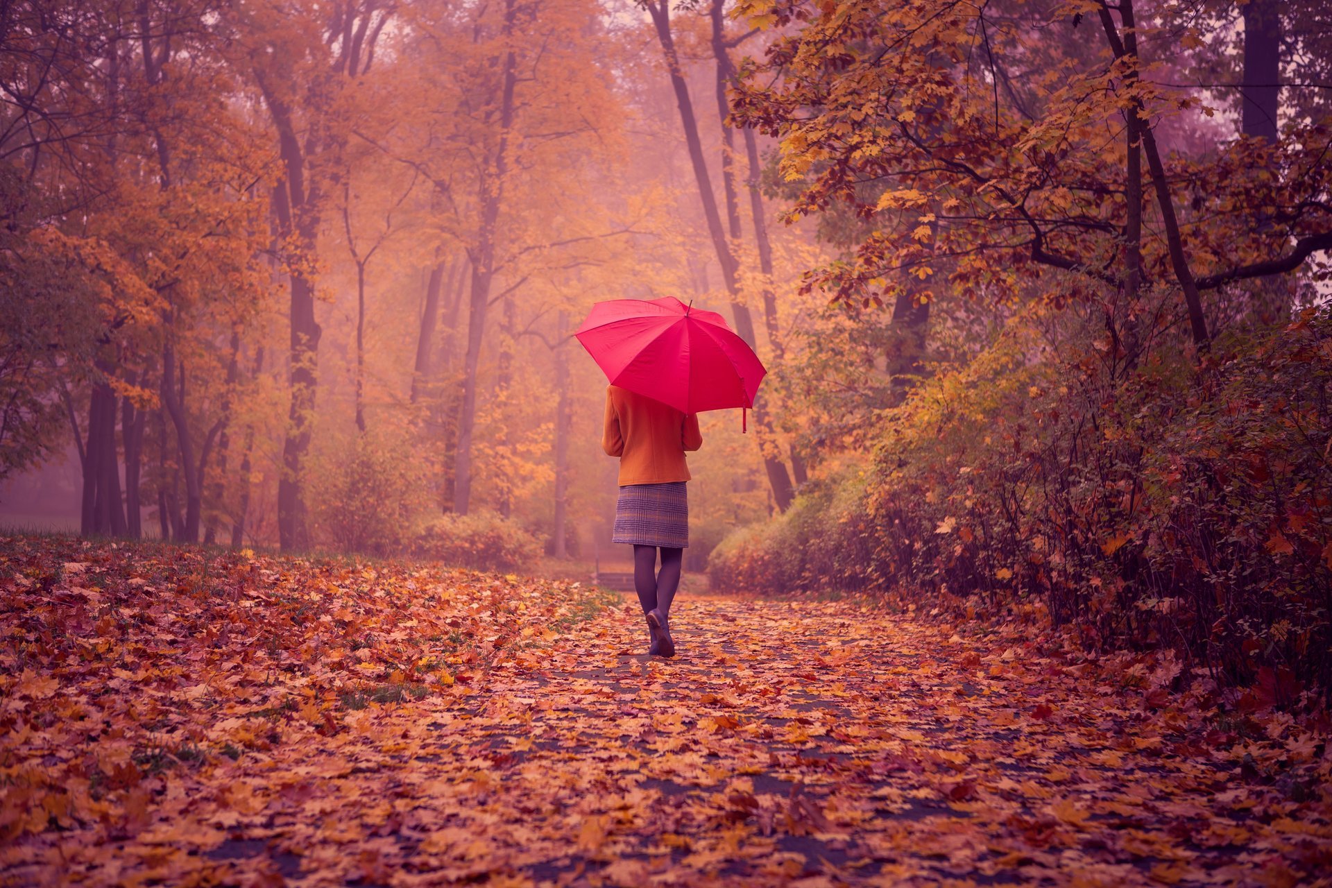 A girl with a red umbrella in an autumn park