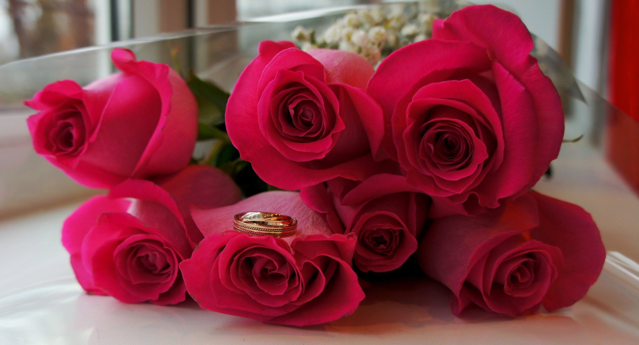 A bouquet of roses on the table. The ring lies on the bud