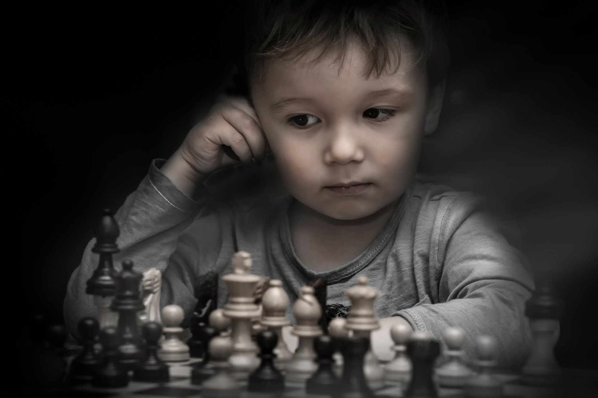A little boy is playing chess
