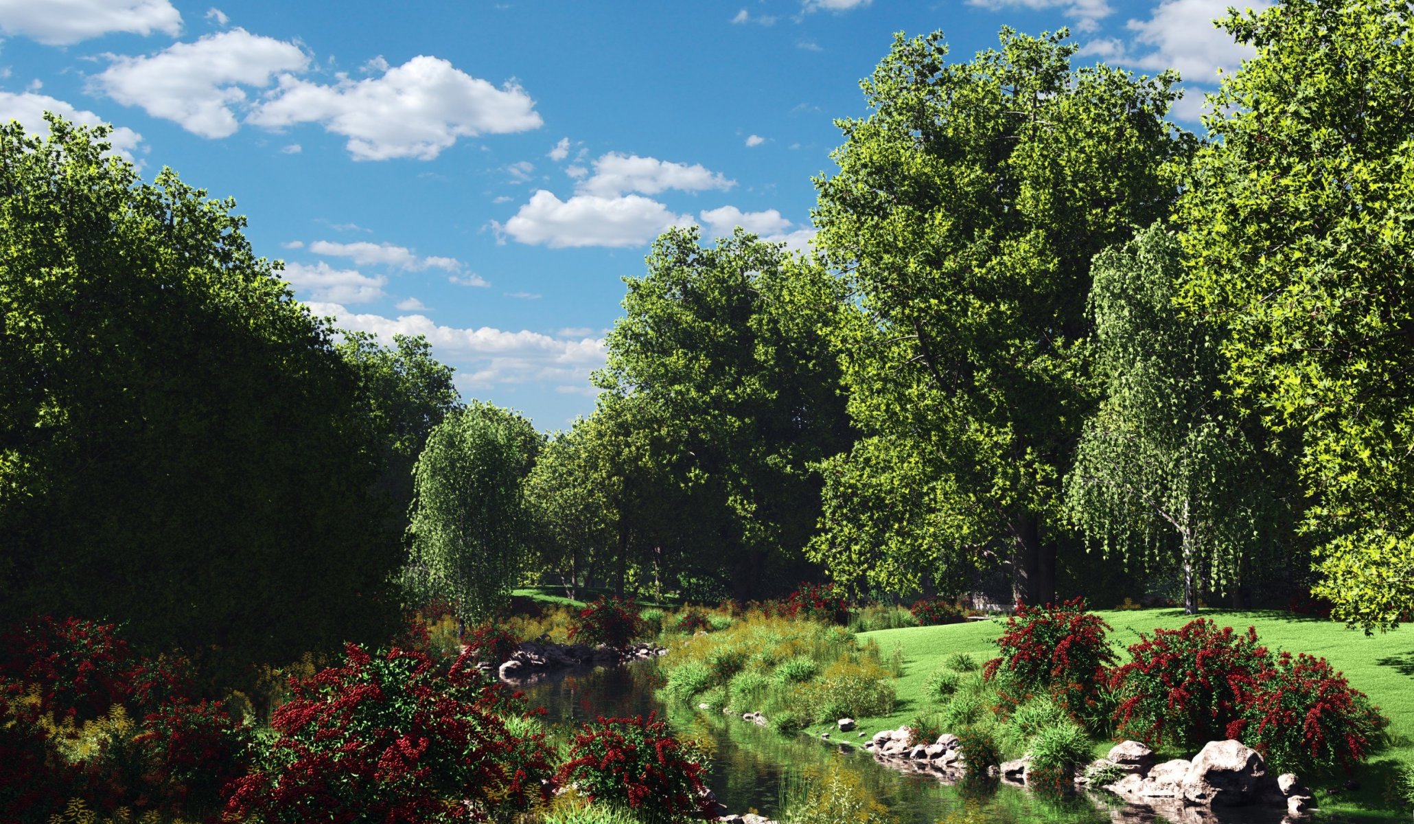 Wonderful nature forest, stream, flowers in the meadowWonderful nature forest, stream, flowers in the meadow