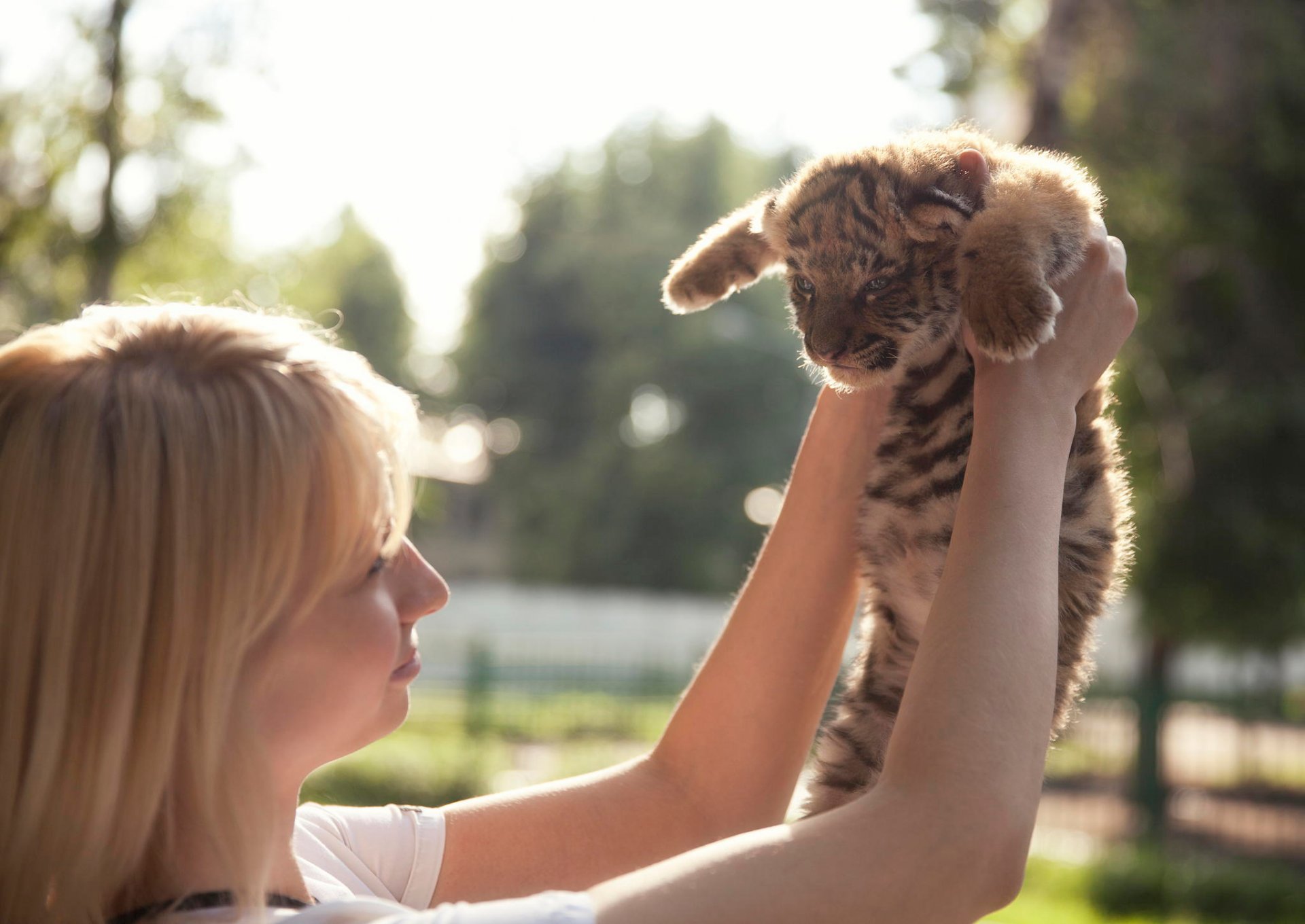The girl lifts the tiger cub in her arms