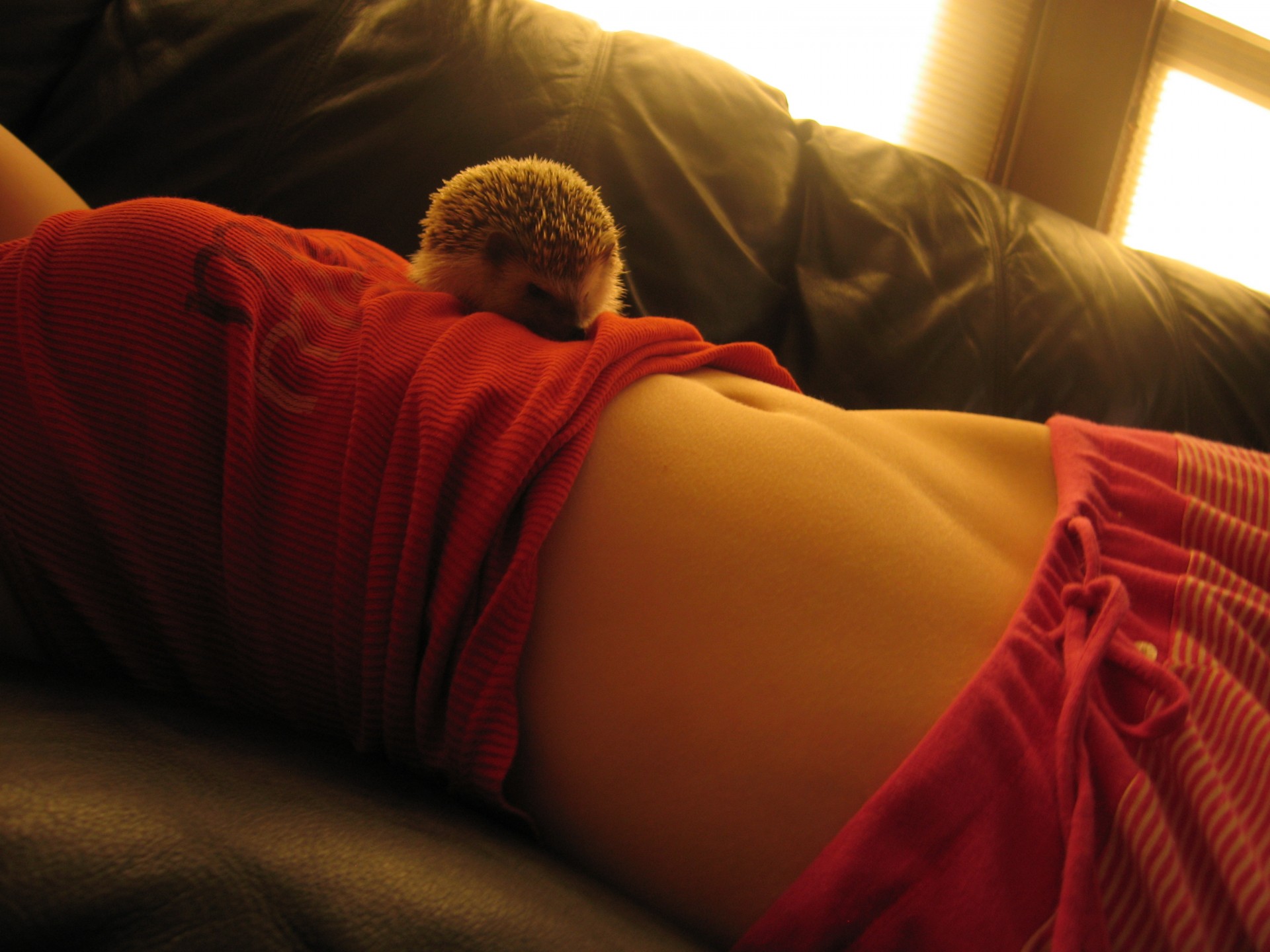 The girl has a hedgehog lying on her stomach in a red t-shirtThe girl has a hedgehog lying on her stomach in a red T-shirt
