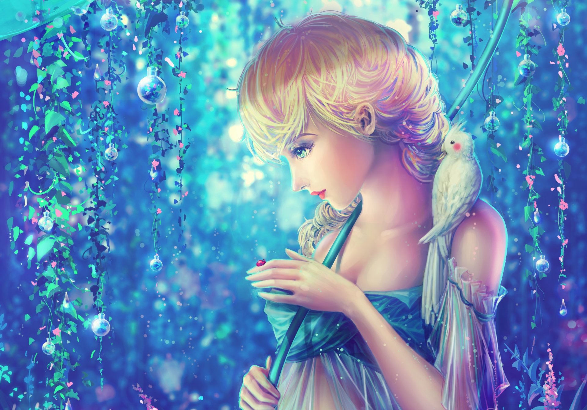 A girl with a parrot on her shoulder looks at a ladybugA girl with a parrot on her shoulder looks at a ladybug
