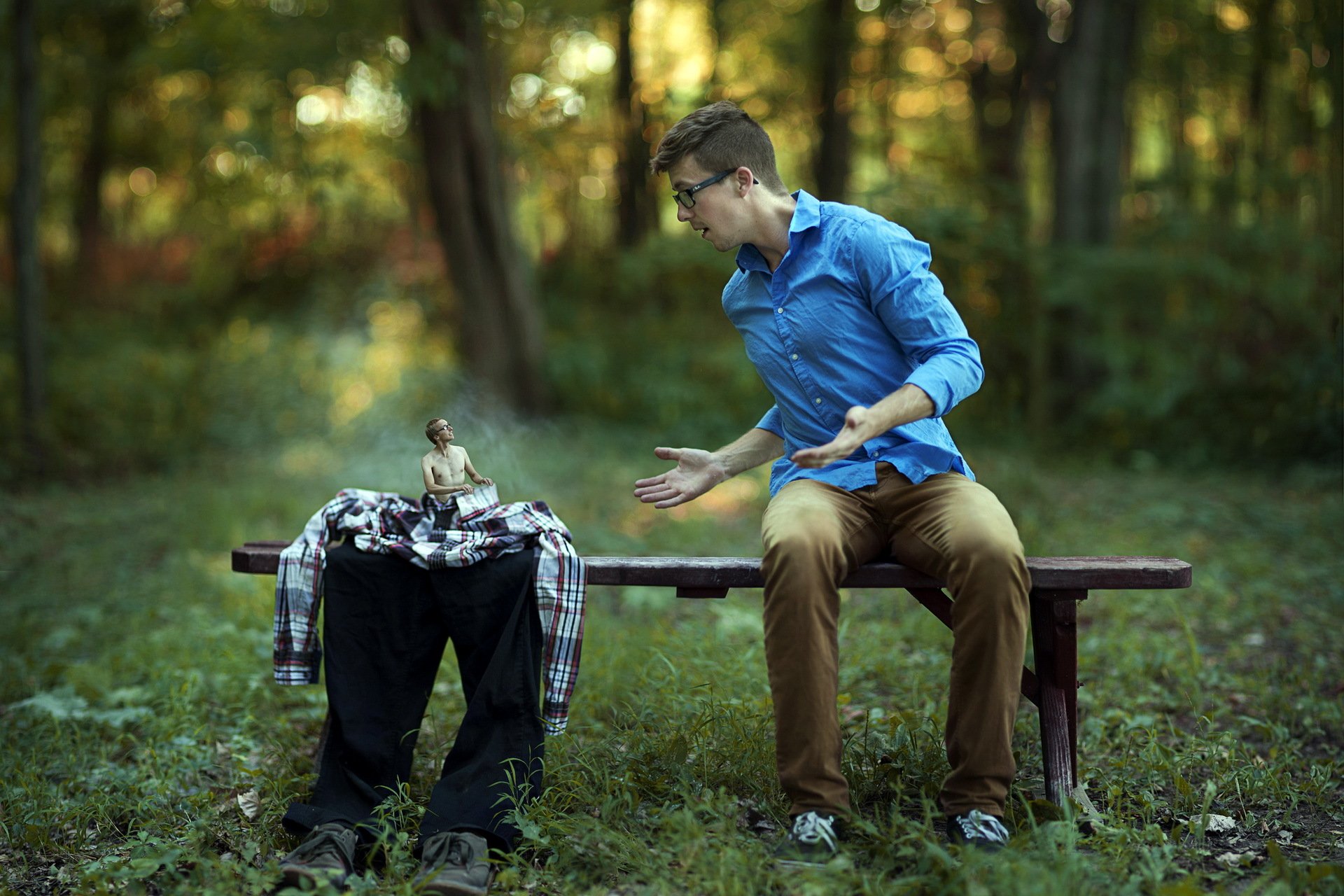 The situation with men sitting on a bench in the parkThe situation with men sitting on a bench in the park
