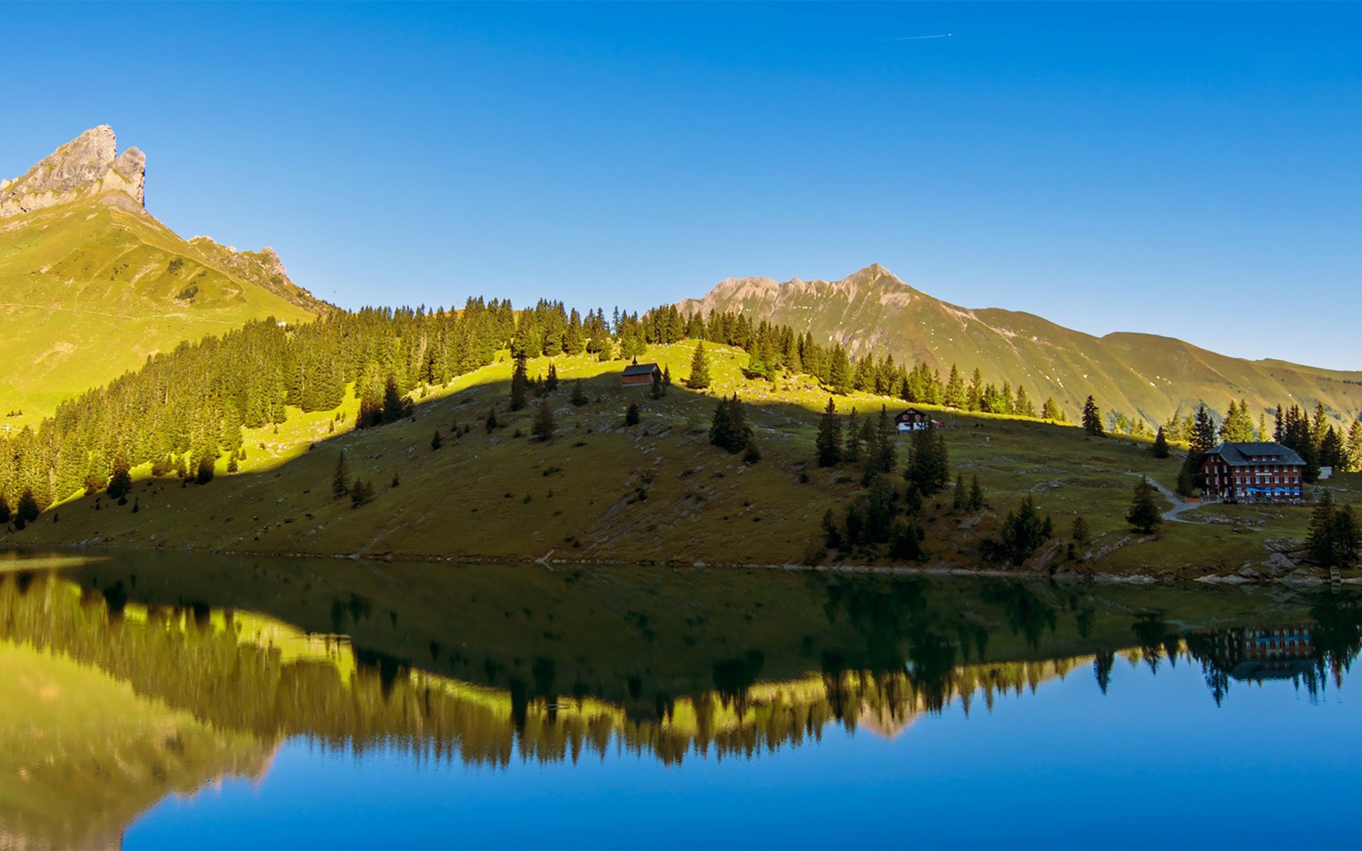 Mountain landscape in the reflection of the water surface with a clear blue sky