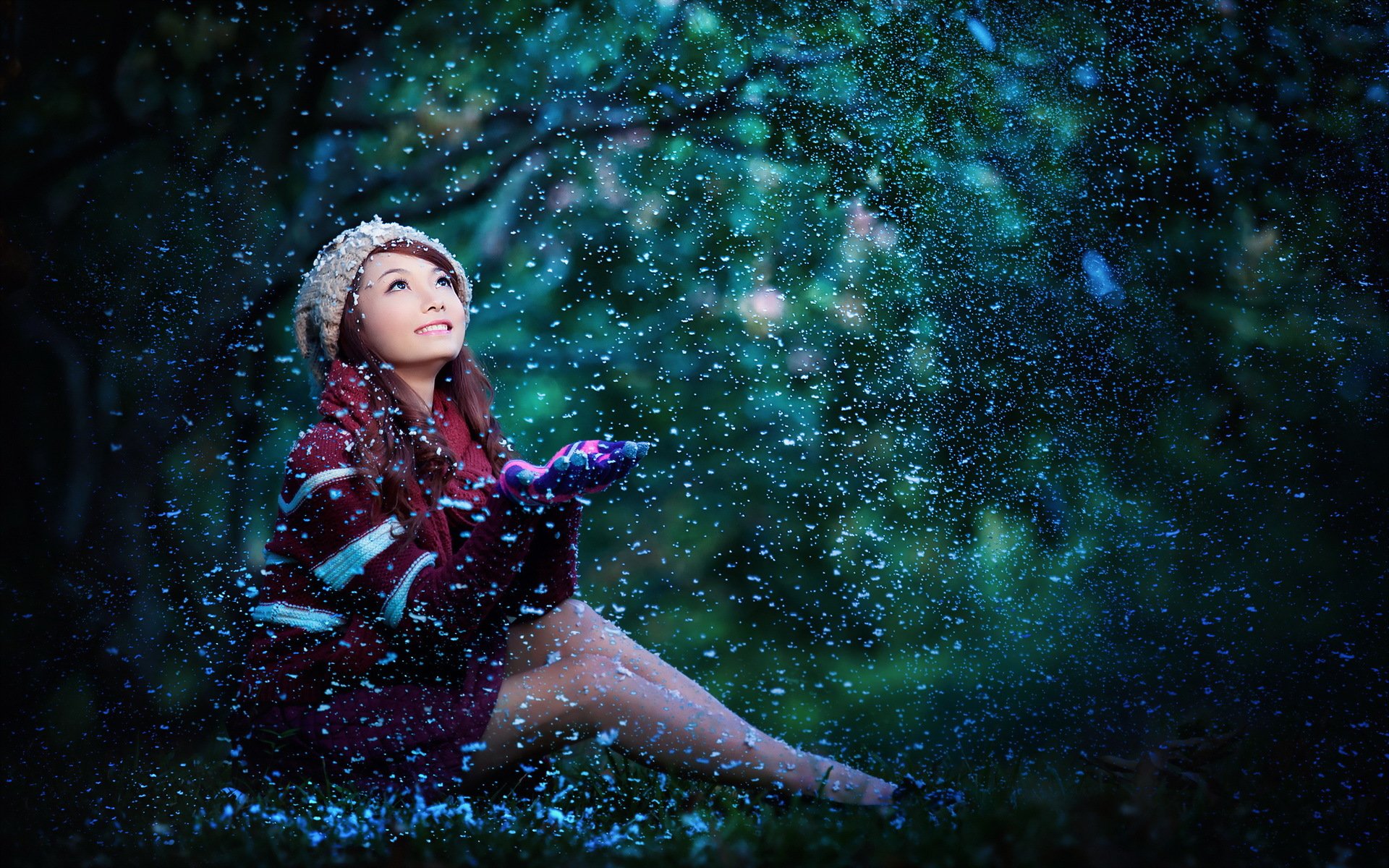 A girl with an Asian appearance catches snowflakes with her palms