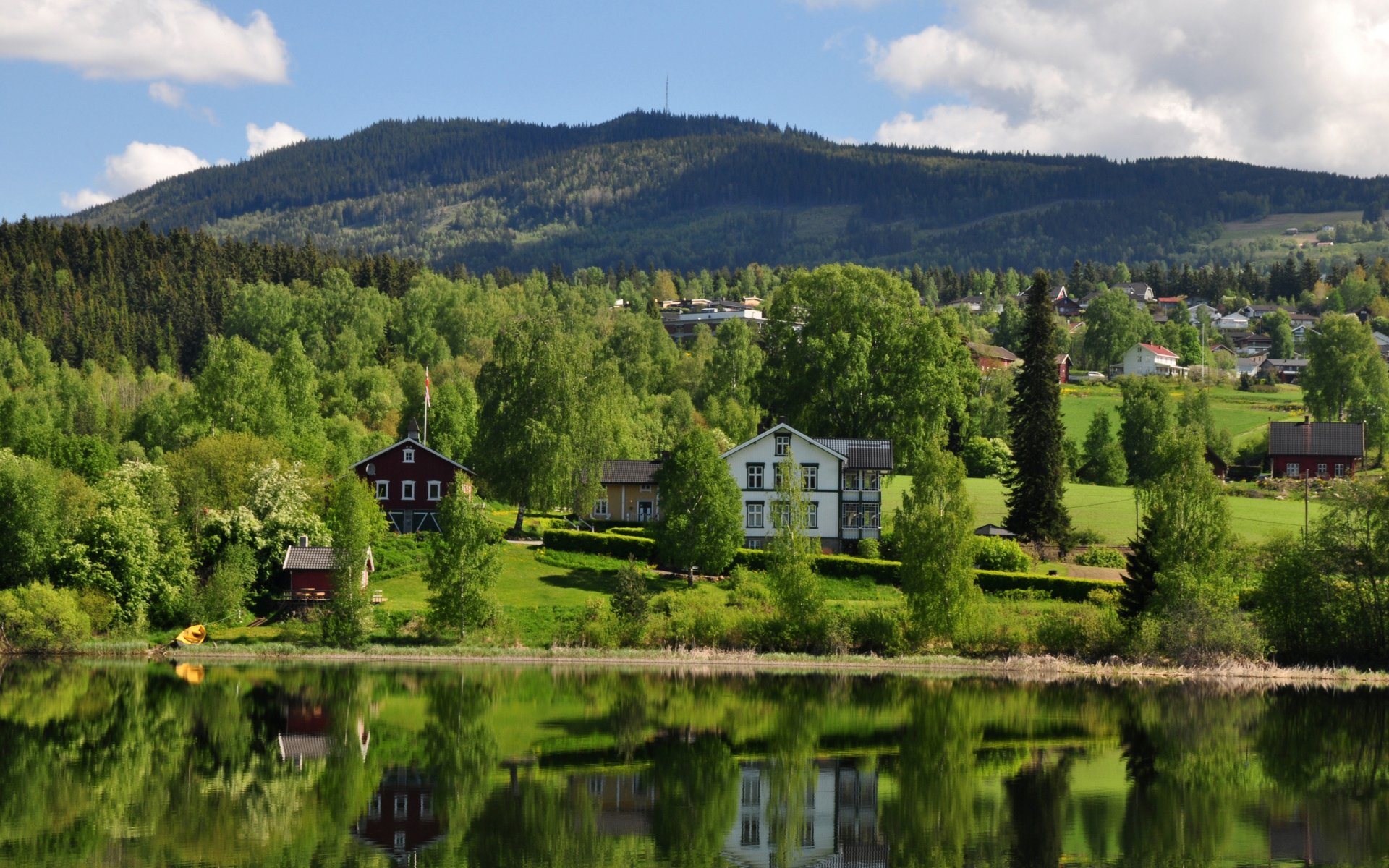 On the shore of a lake in norway. sunset reflection in the waterOn the shore of a lake in Norway. Sunset reflection in the water