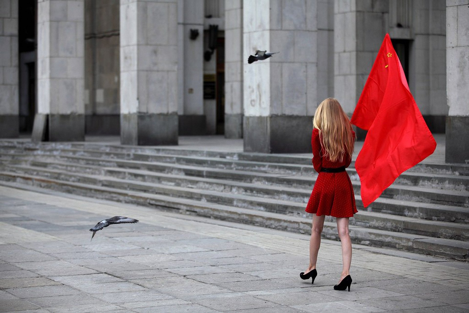 Beautiful girl with a flag and pigeons
