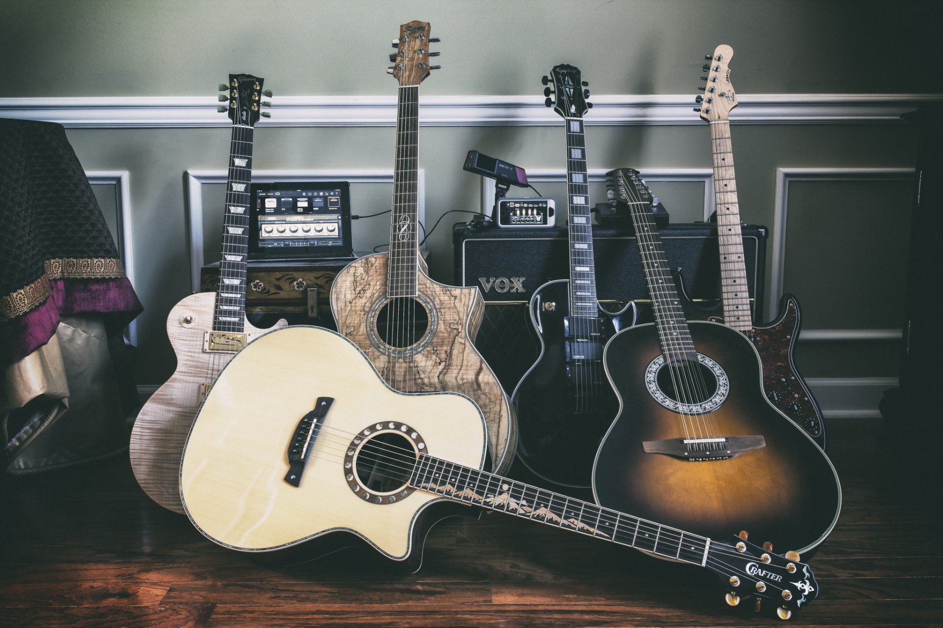 A girl plays an electric guitar standing on the couchA girl plays an electric guitar standing on the couch