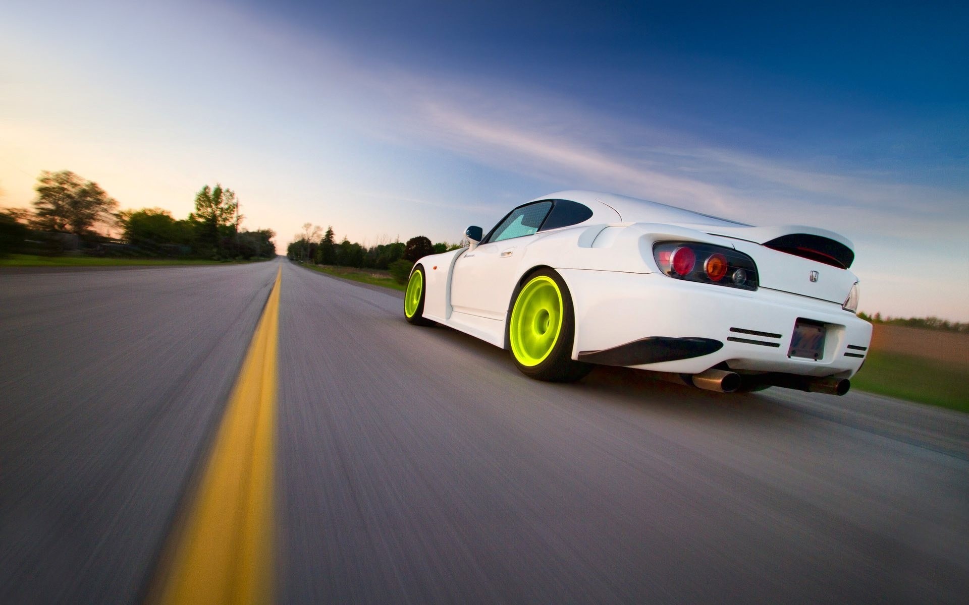 Sporty white Honda with green wheels