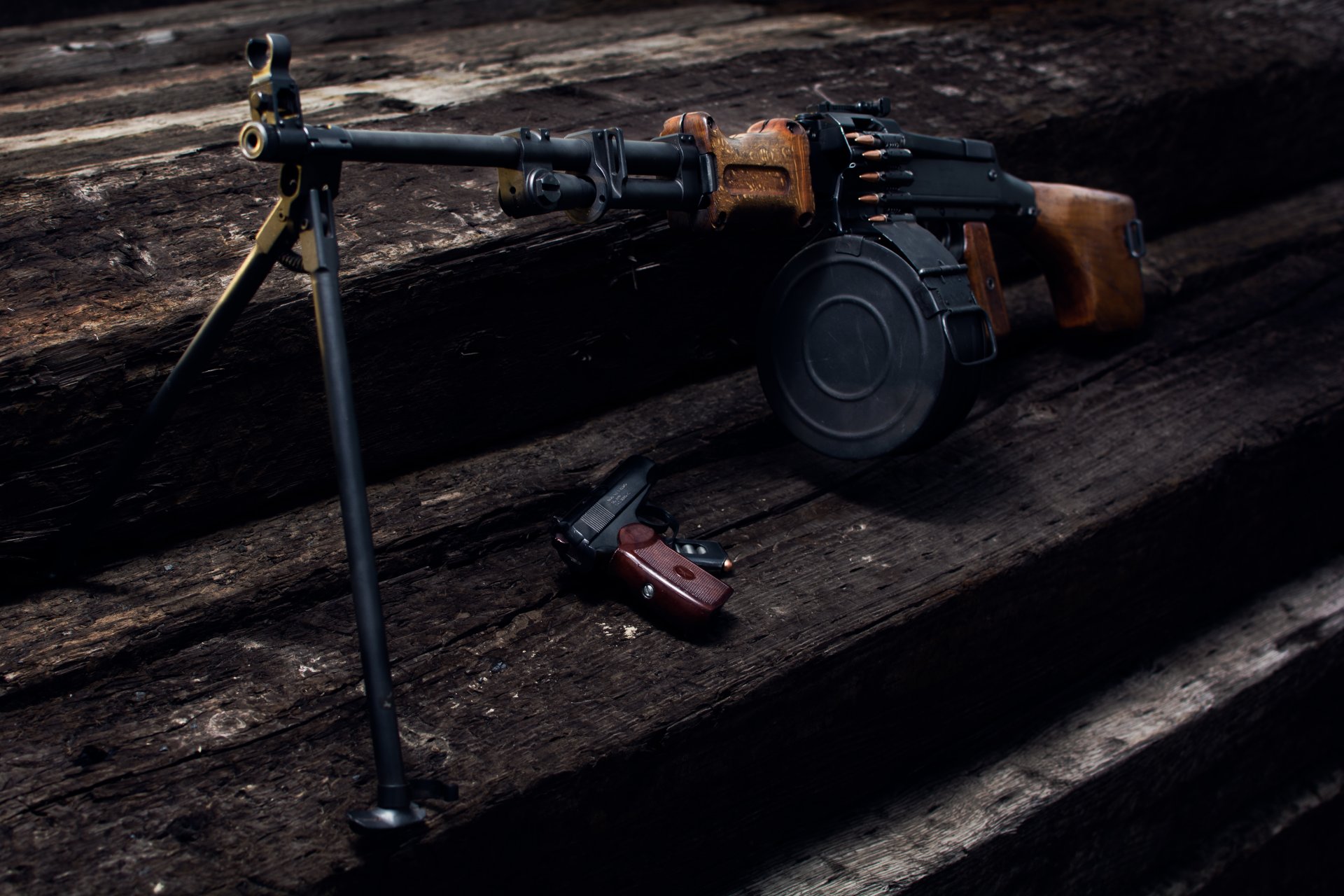 A soldier with a machine gun walks across the fieldA soldier with a machine gun walks across the field