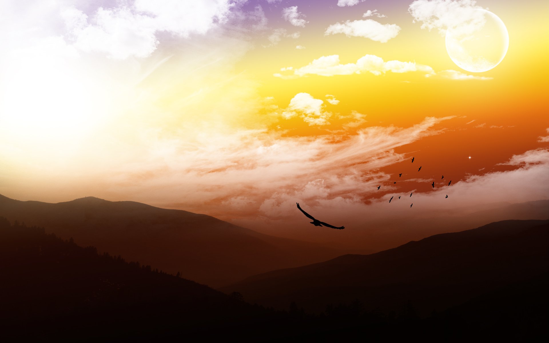 A flock of birds flying through the most gorgeous beauty of the sky