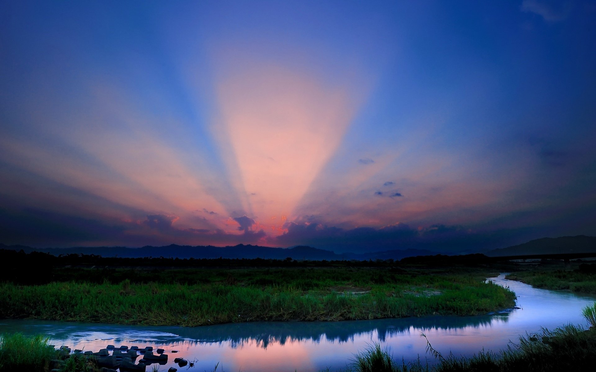 An island with tall trees surrounded by a water surface on the background of mountain ranges