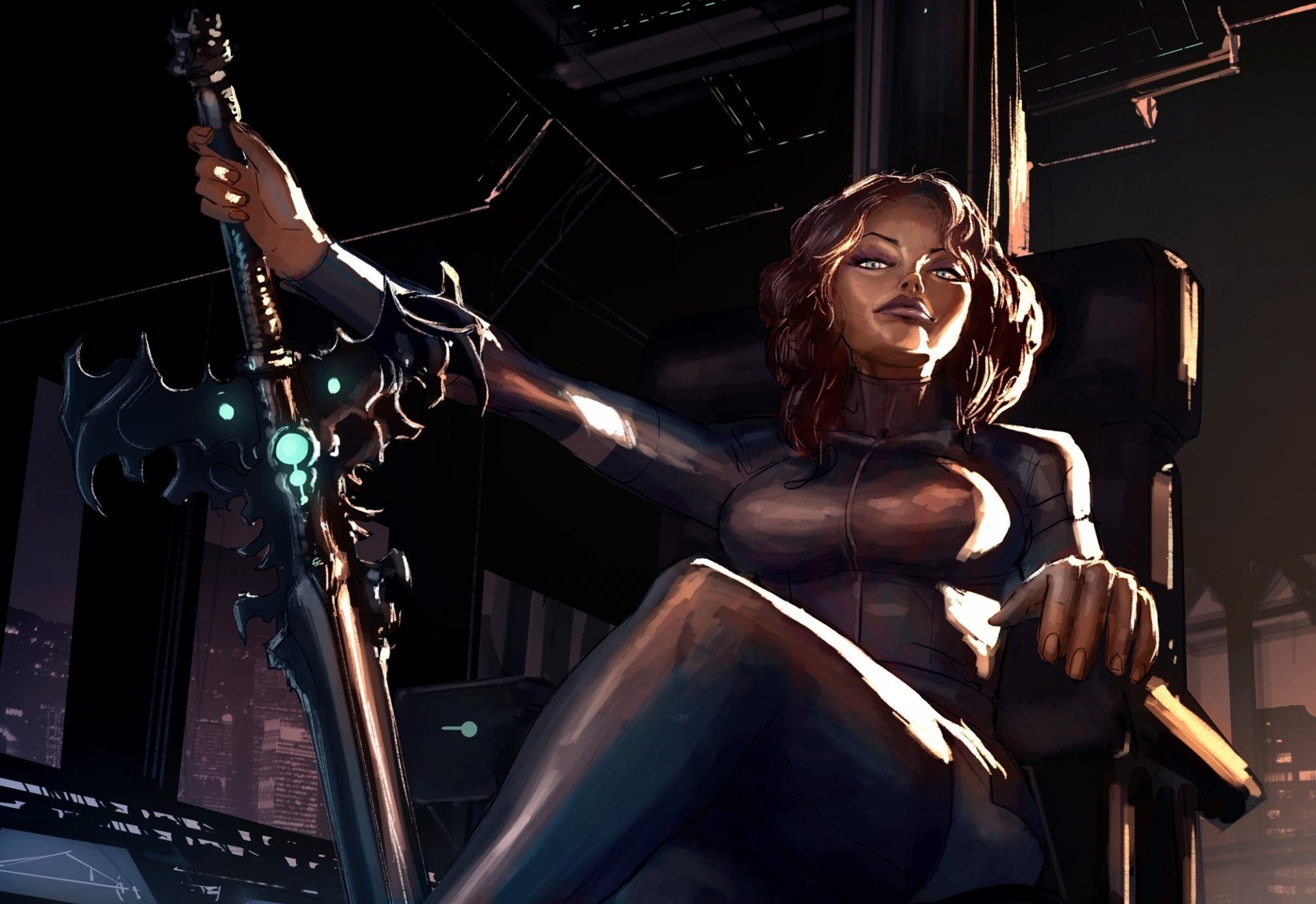 The girl is sitting with a sword