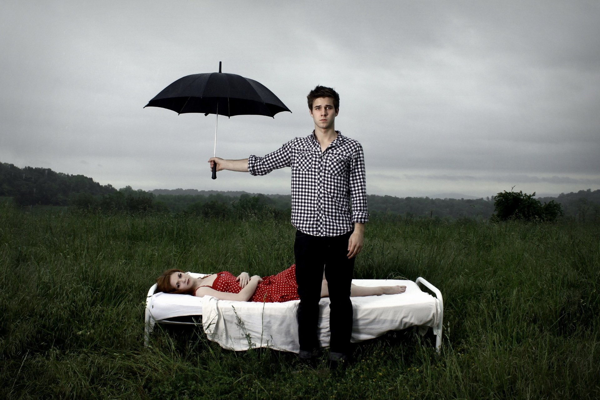 The guy holds an umbrella over the lying girl