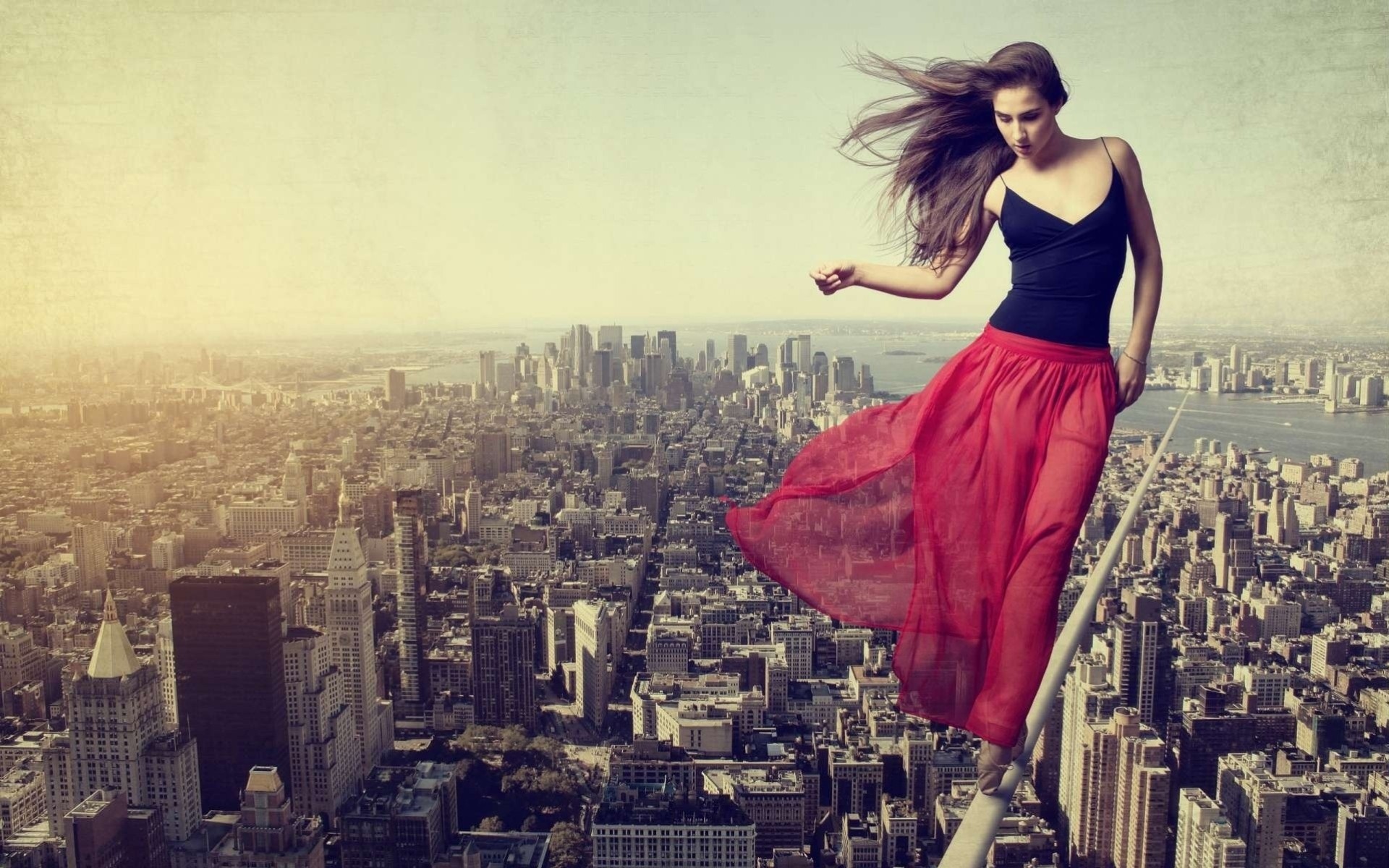 A girl on a pole at a height above the city