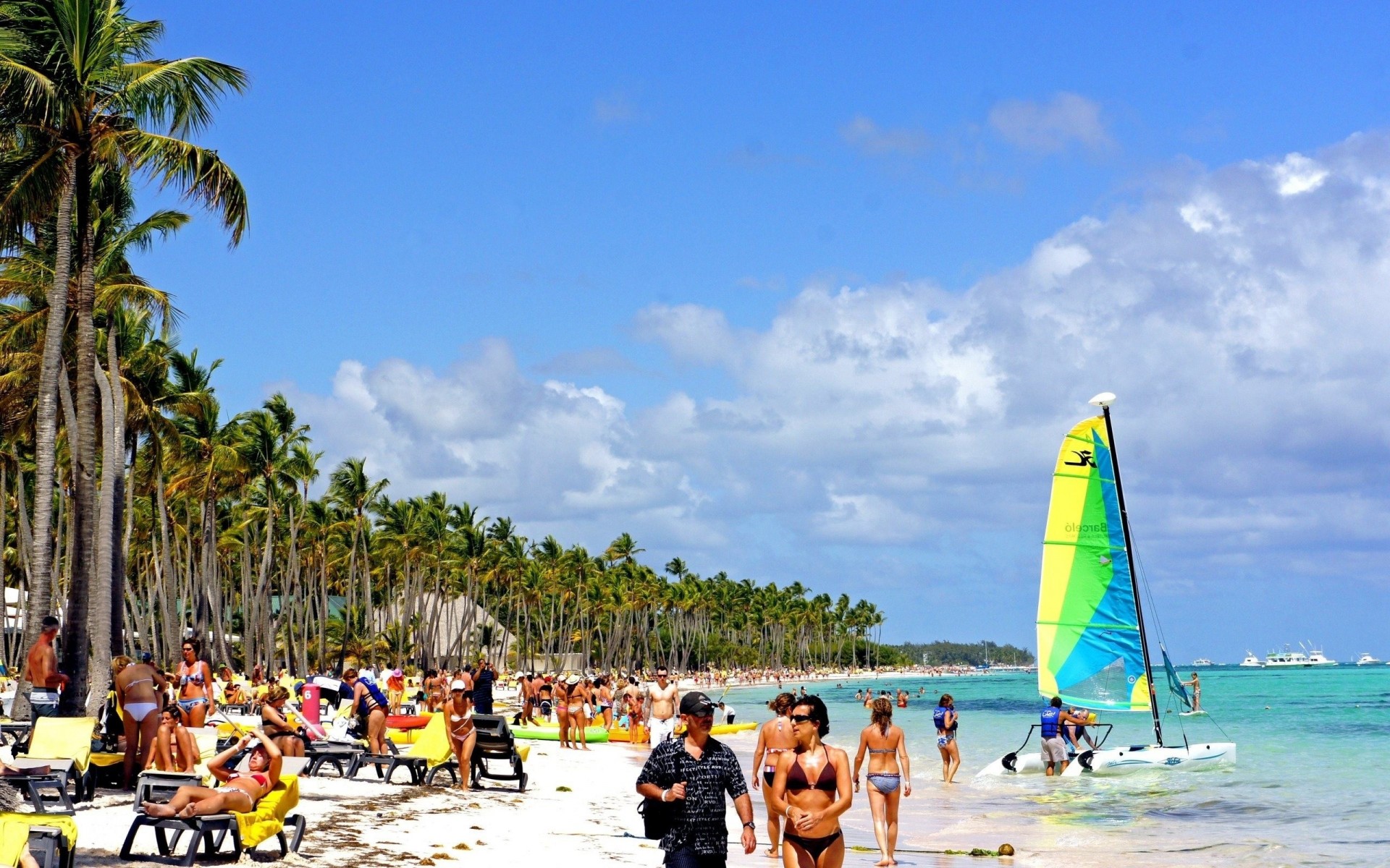 Girl on the beach with white sand and palm tree
