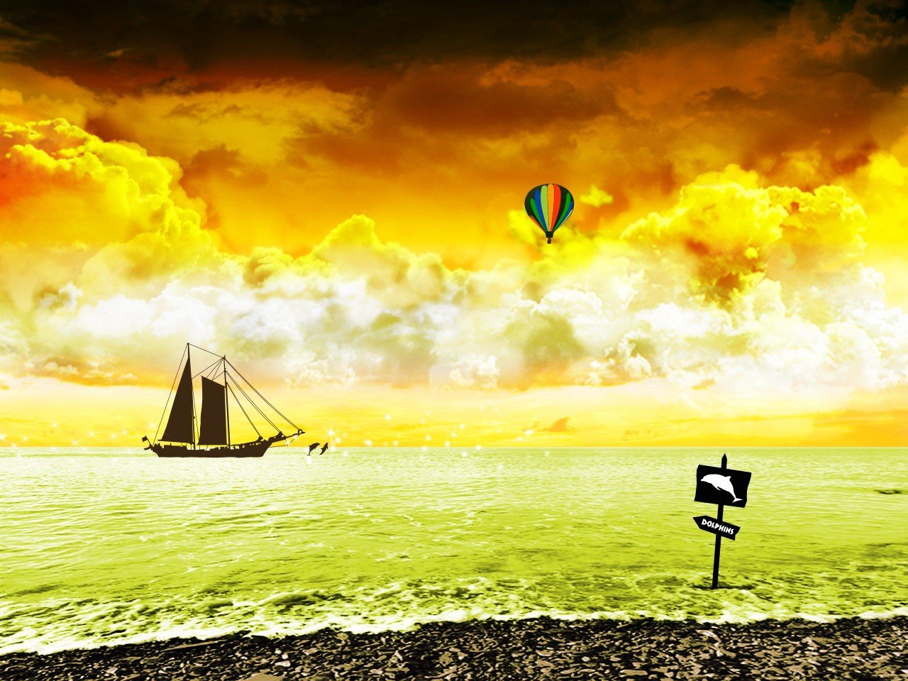 The drawing of the sea reflects the orange sky, a ship is sailing in the distance