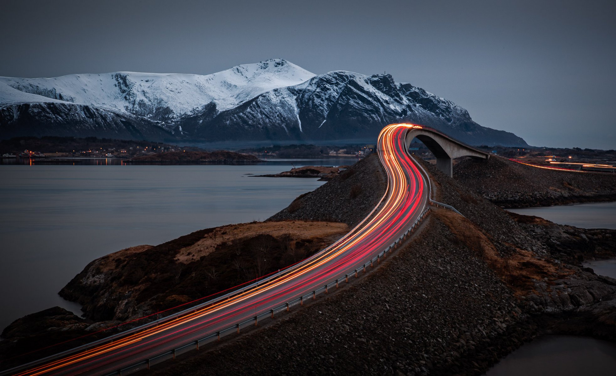 A long road in a field with a round moon turning yellow on the horizonA long road in a field with a round moon turning yellow on the horizon
