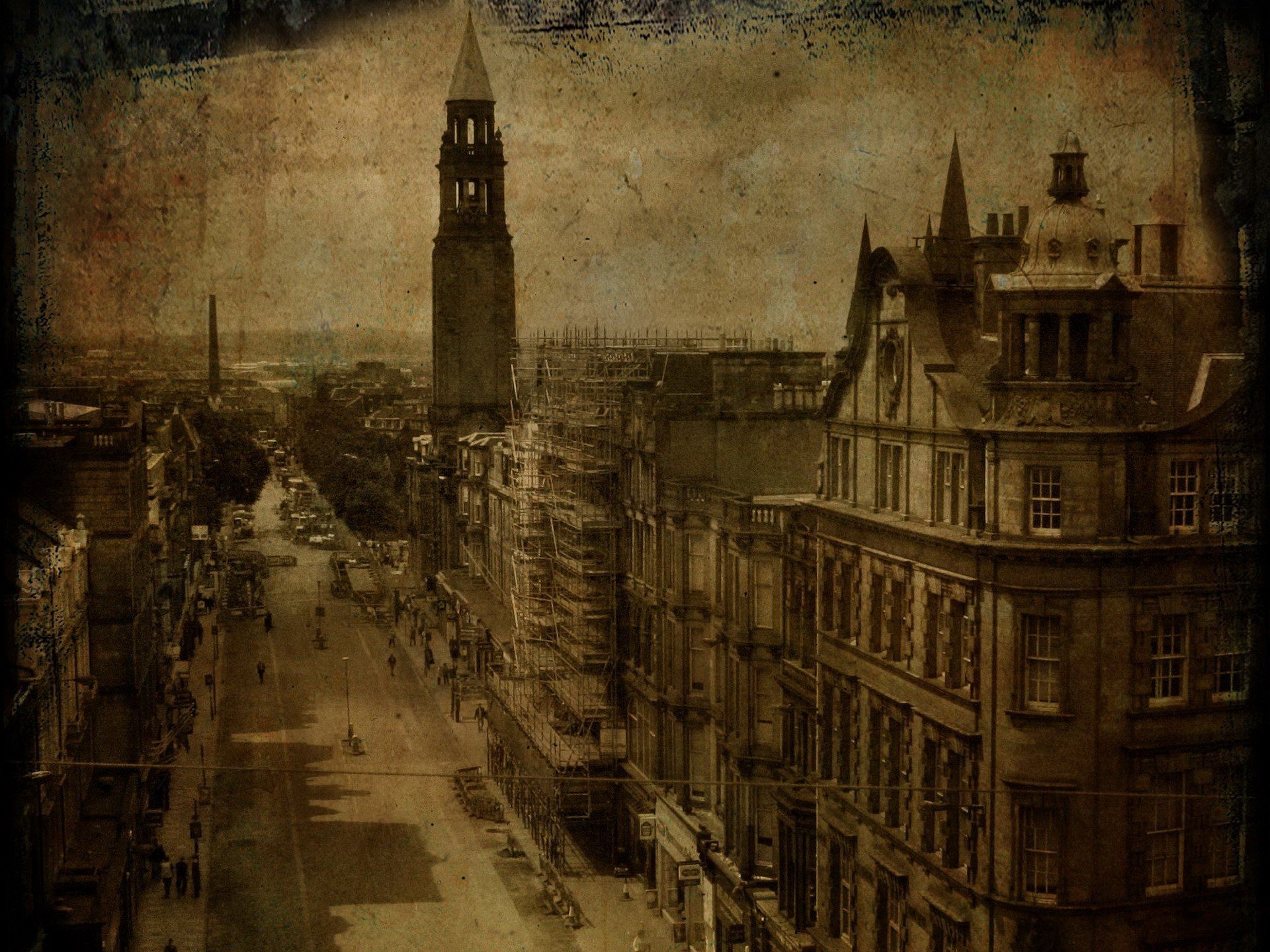 A house abandoned by people with broken windows, an unmade bed and shelves with the remaining dishes in black and white