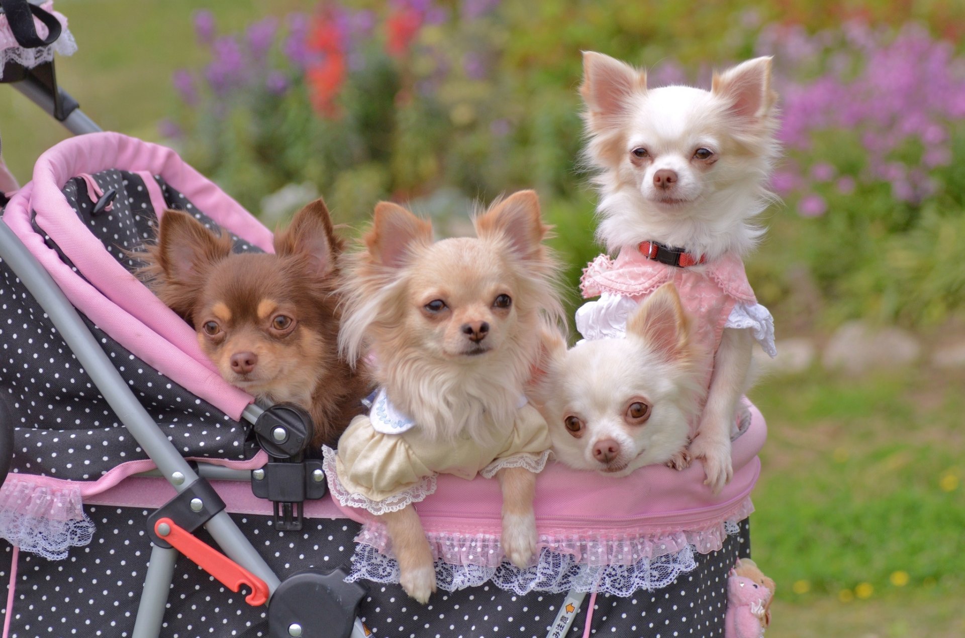 Cute Chihuahuas walking in a stroller