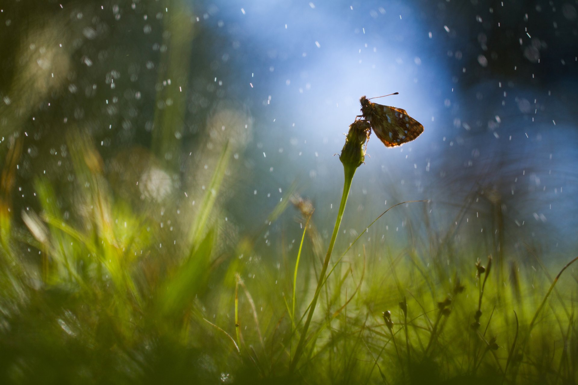 Butterfly on a dandelion with rain highlights in the grass