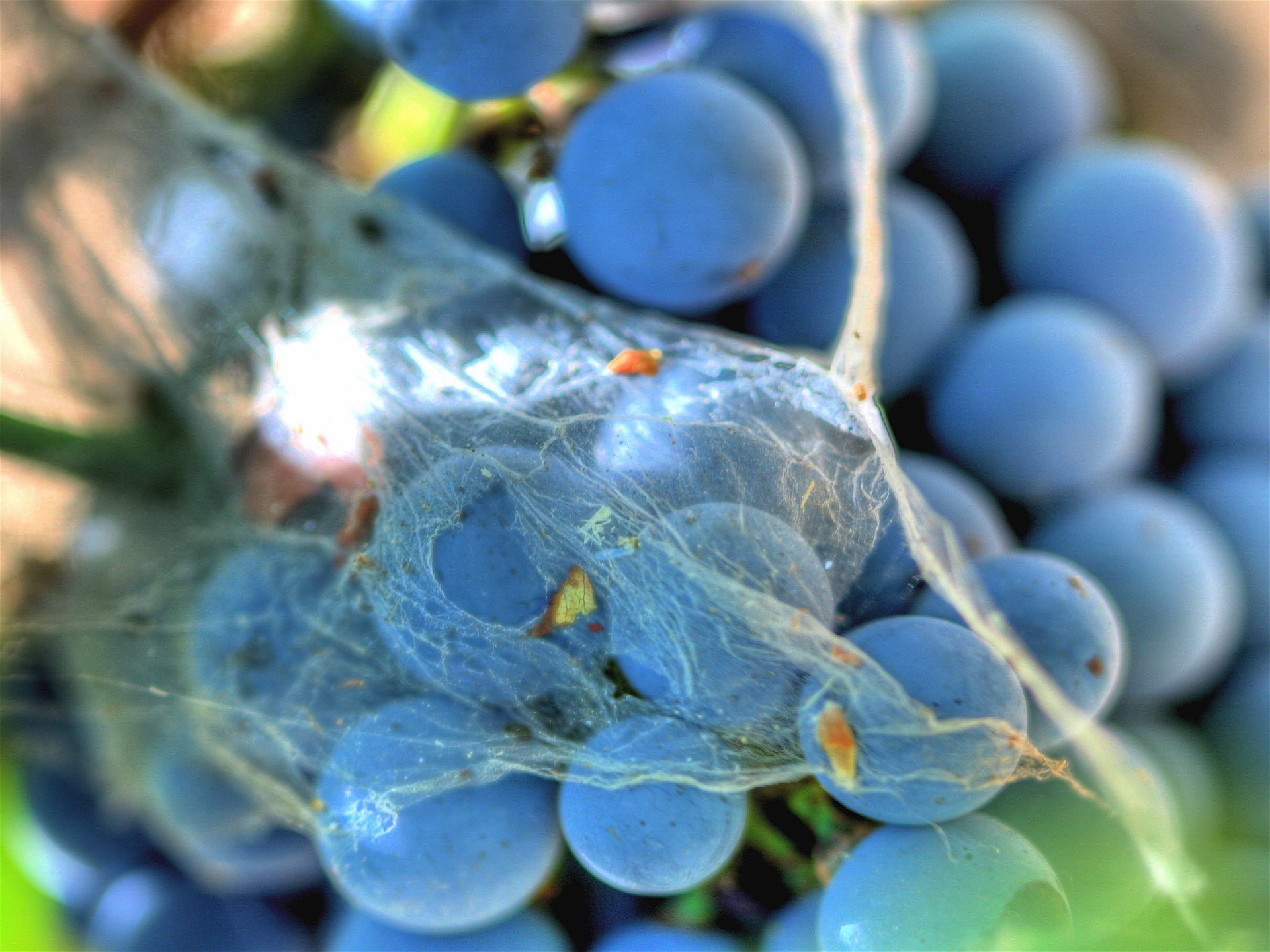 Blue berries entangled in cobwebs