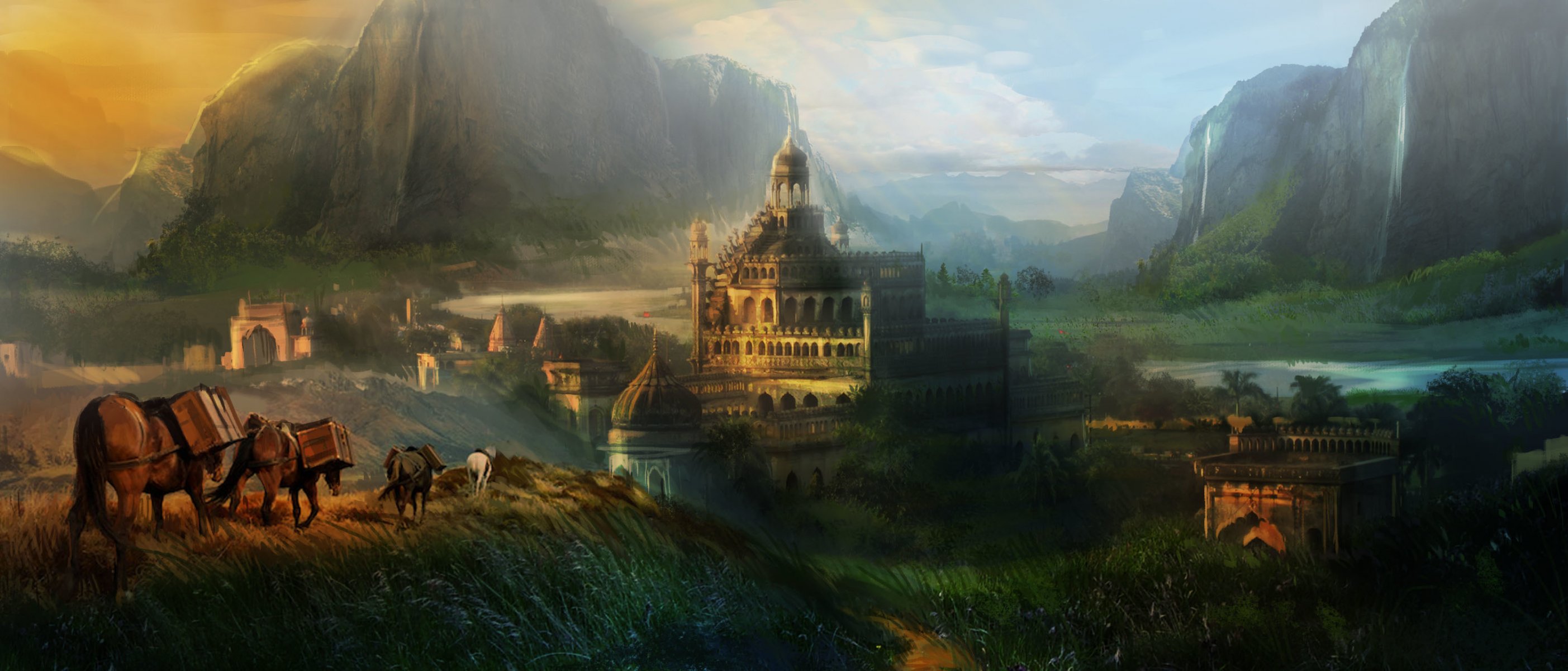 A caravan of horses on the background of mountains and waterfallsA caravan of horses on the background of mountains and waterfalls