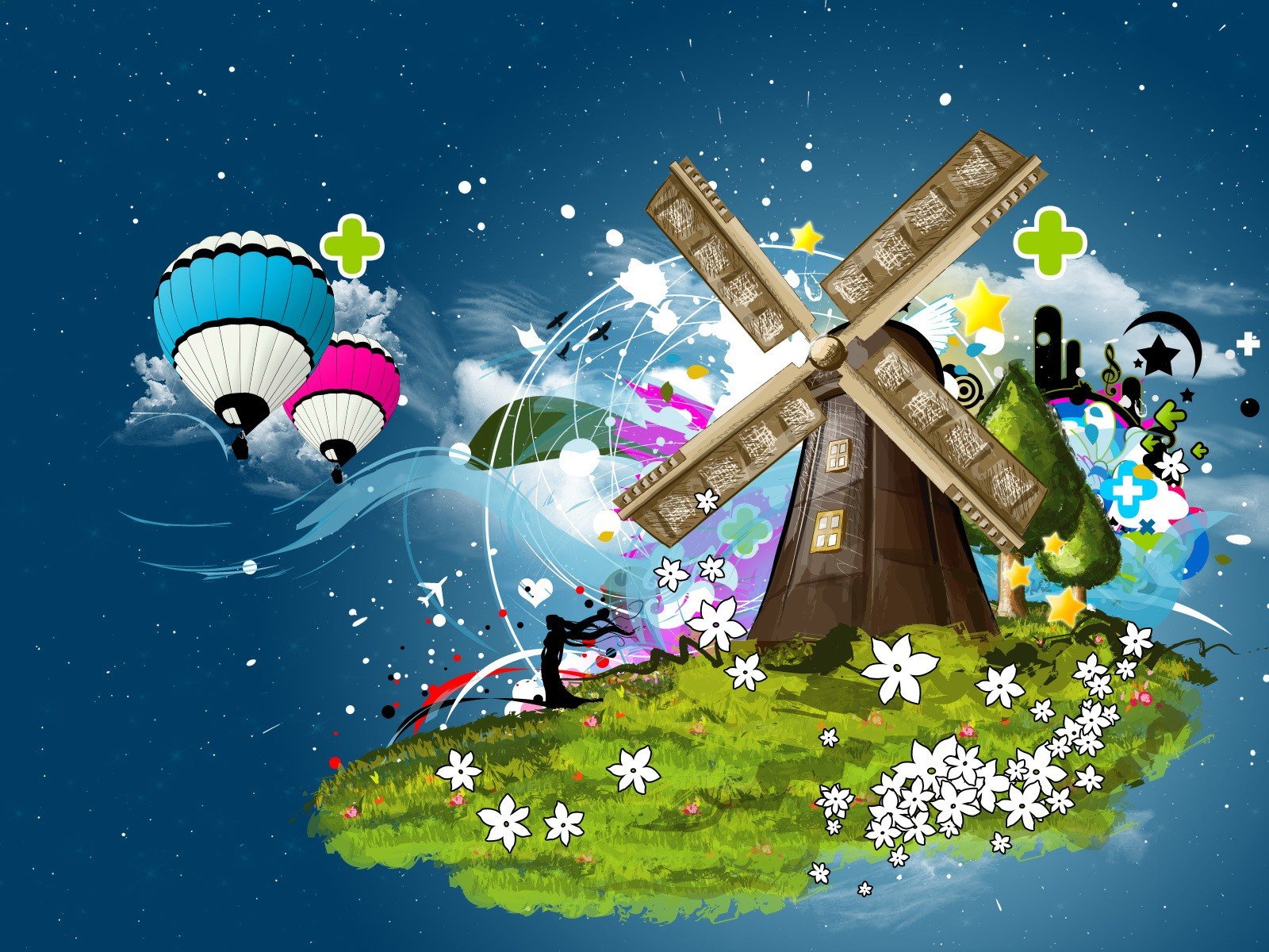 Collage of a mill with flowers and colored balls