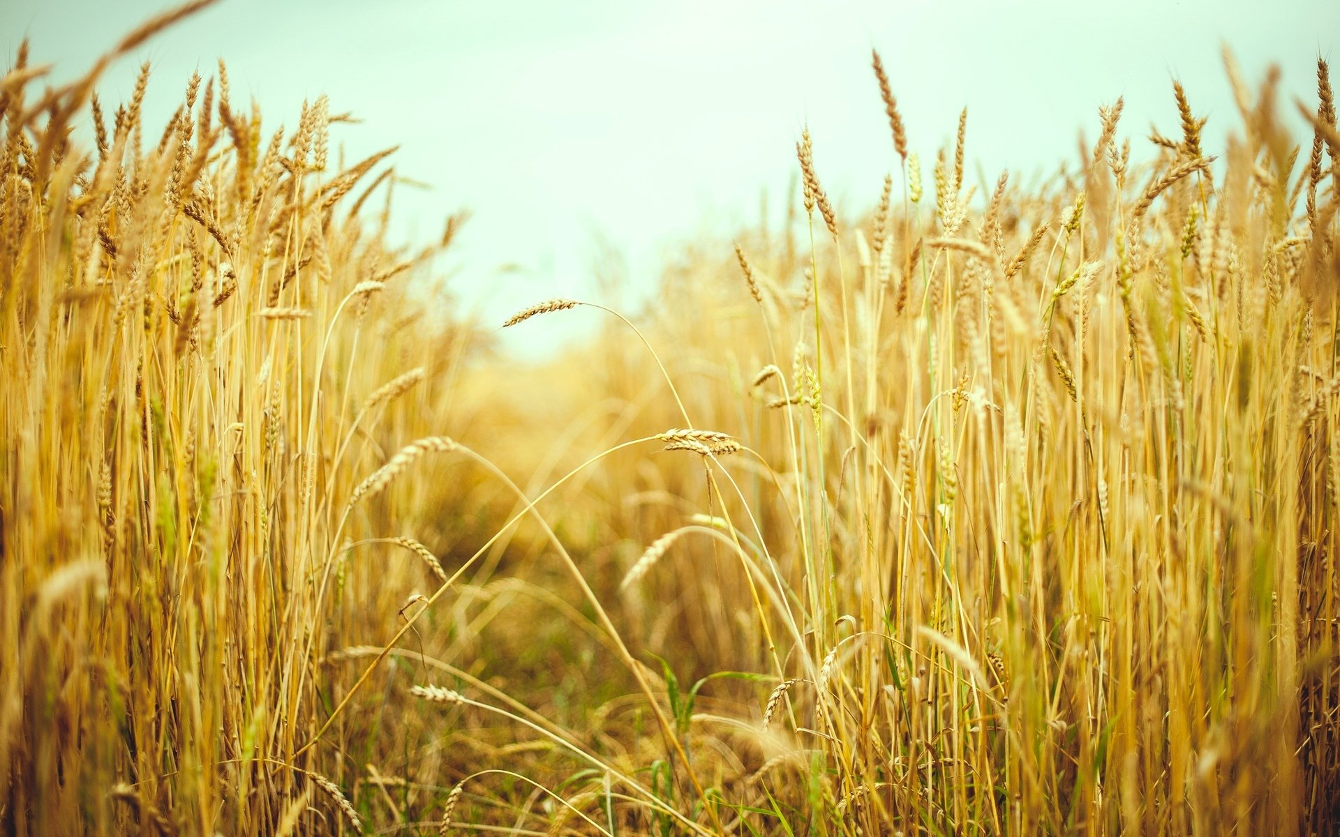 A macro wheat field of yellow color against the background of a bright blue sea under the summer sunA macro wheat field of yellow color against the background of a bright blue sea under the summer sun