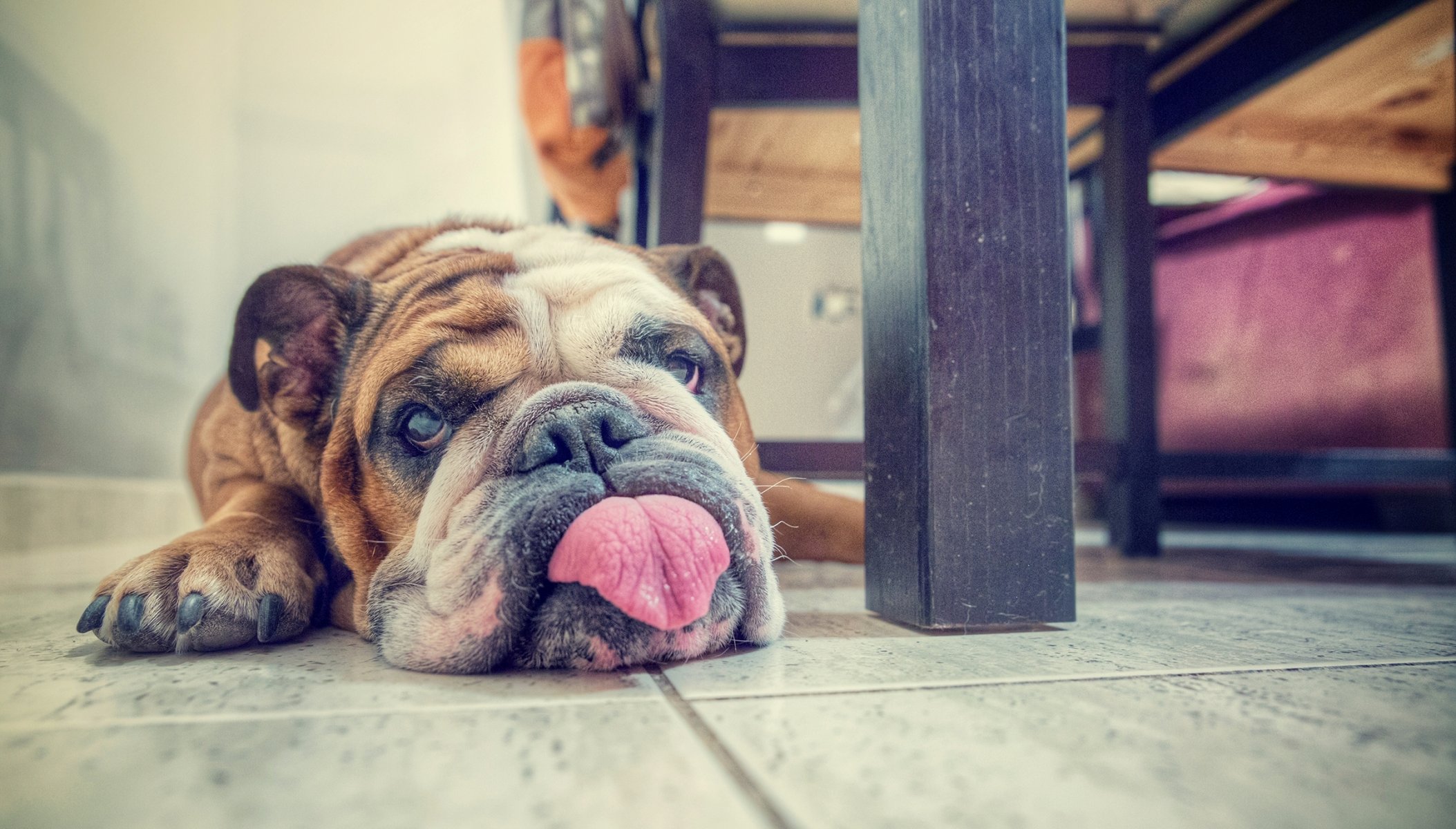 A brown dog with a scarf around his neck and his tongue sticking out against the background of nature
