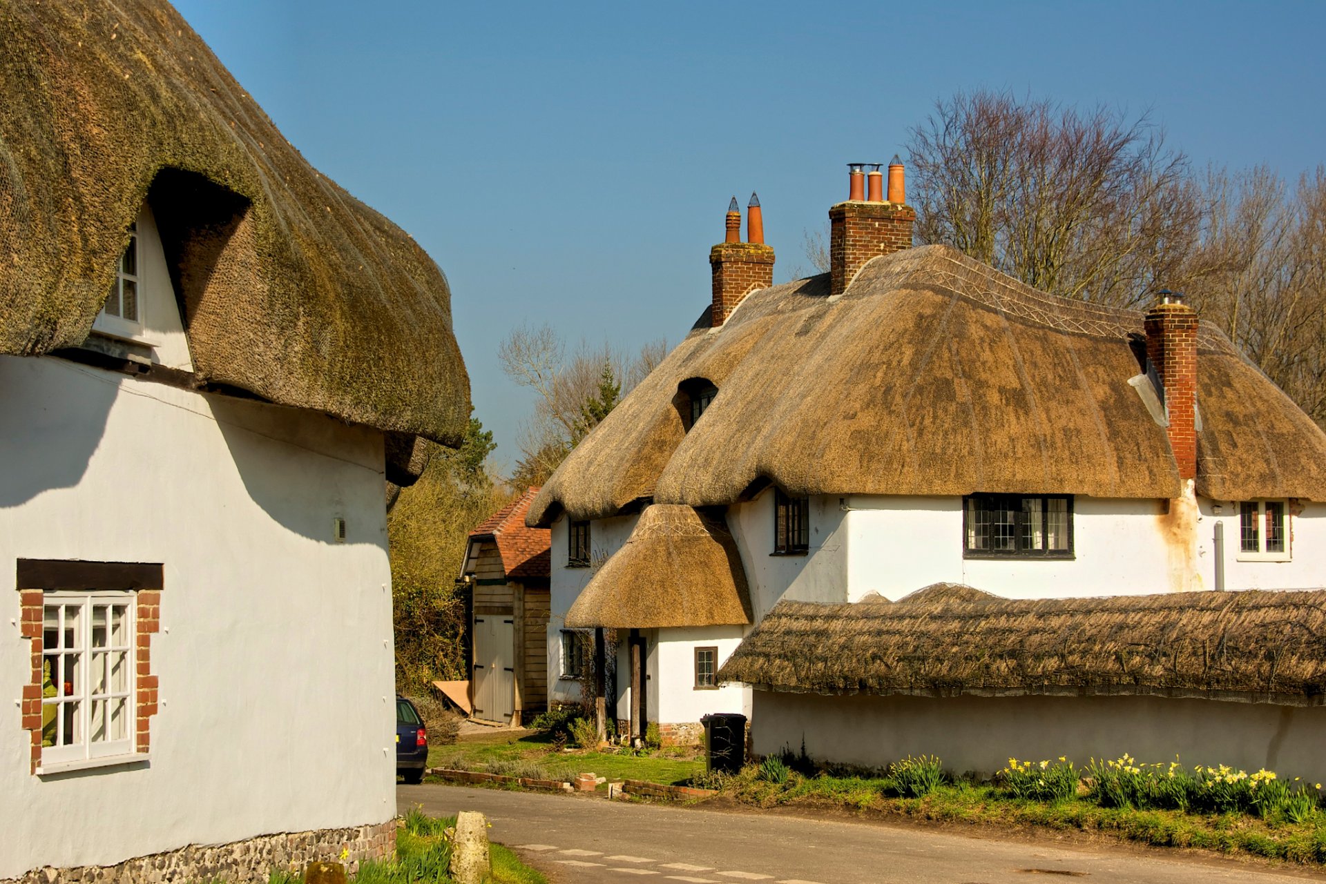 Two white houses with an unusual roof and chimneysTwo white houses with an unusual roof and chimneys