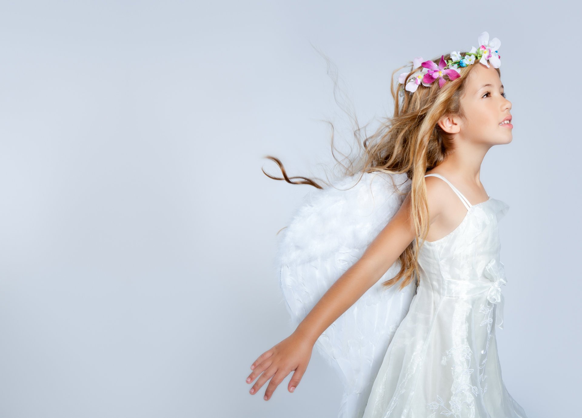 A girl with wings and a wreath on a white backgroundA girl with wings and a wreath on a white background