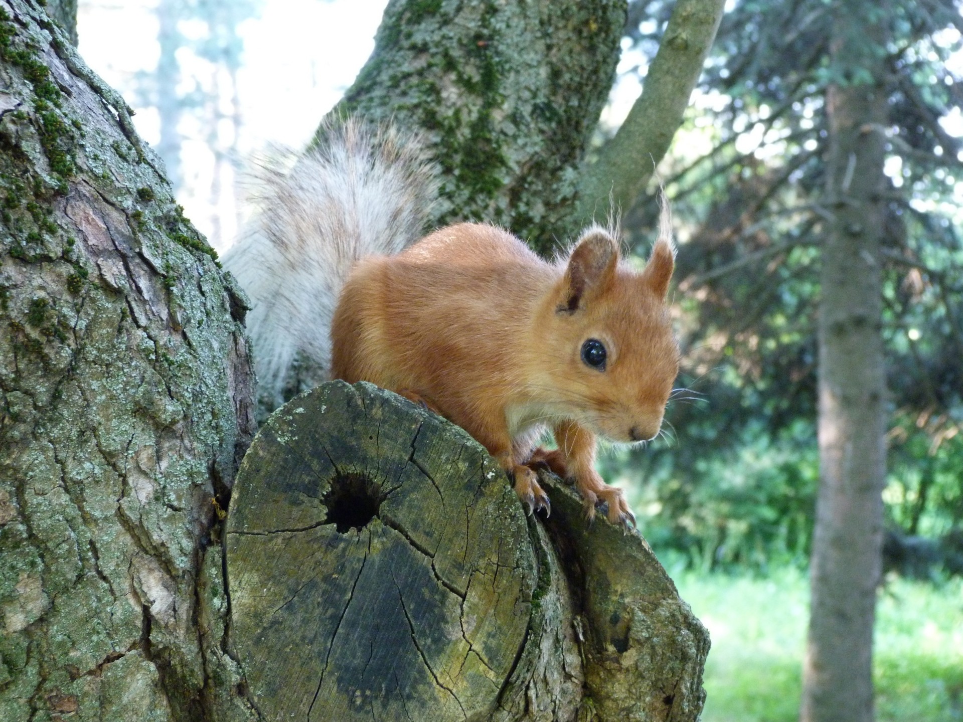 Massive jump of a beautiful red squirrel with a fluffy tail
