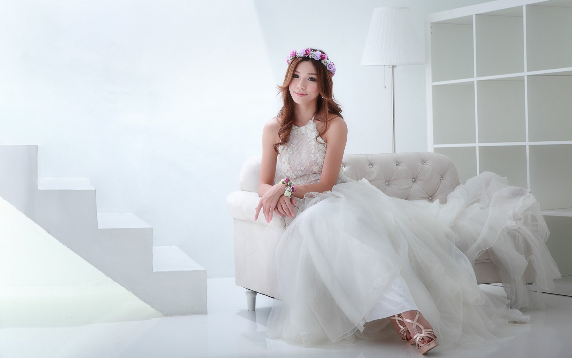 A girl with a wreath in her hair in a snow-white dress on a white sofaA girl with a wreath in her hair in a snow-white dress on a white sofa