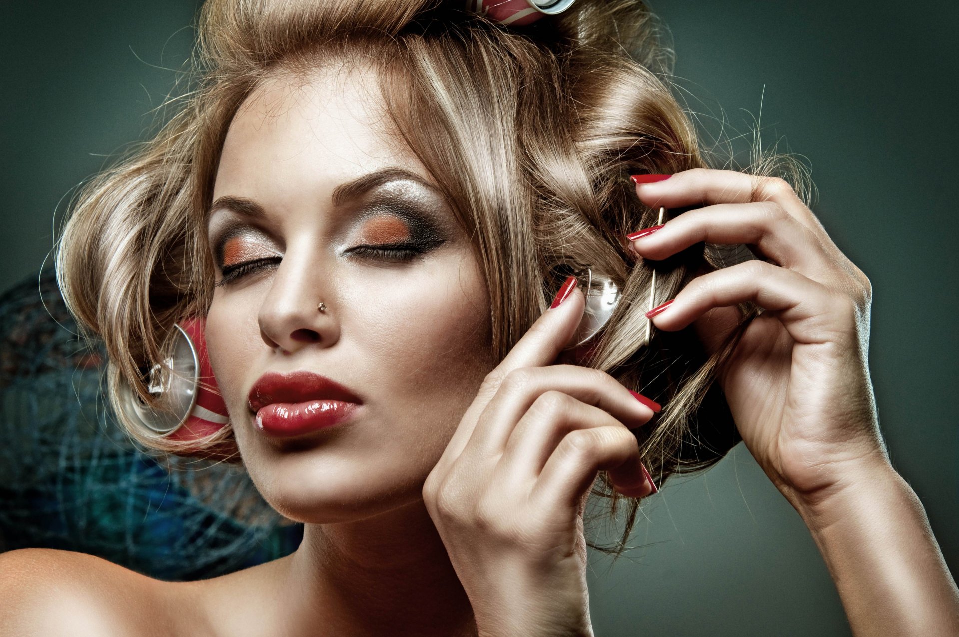 A girl with piercings with bright makeup and curlers
