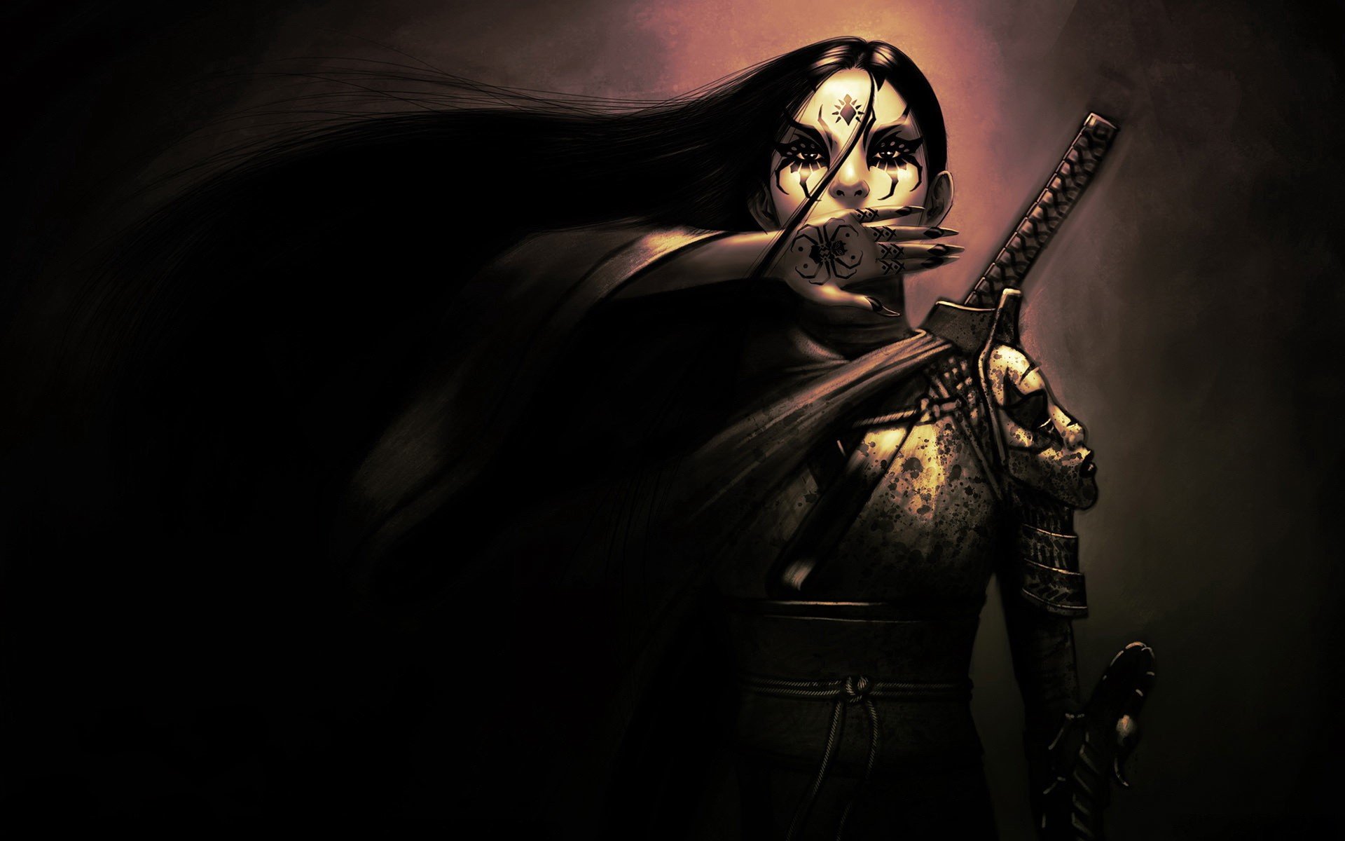 The character of the game Mortal Kombat Kuan Chi is charged with magic in anticipation of a deadly battle
