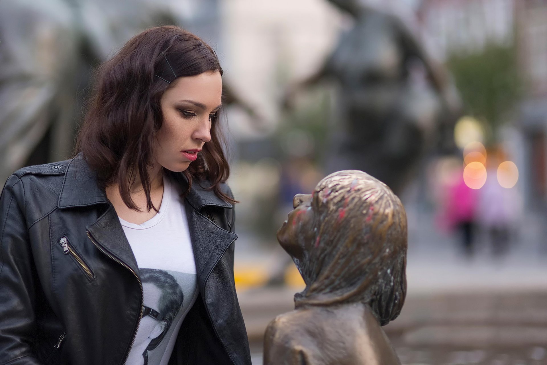In the wild, in the spring, the gray wolf looks with his piercing gaze