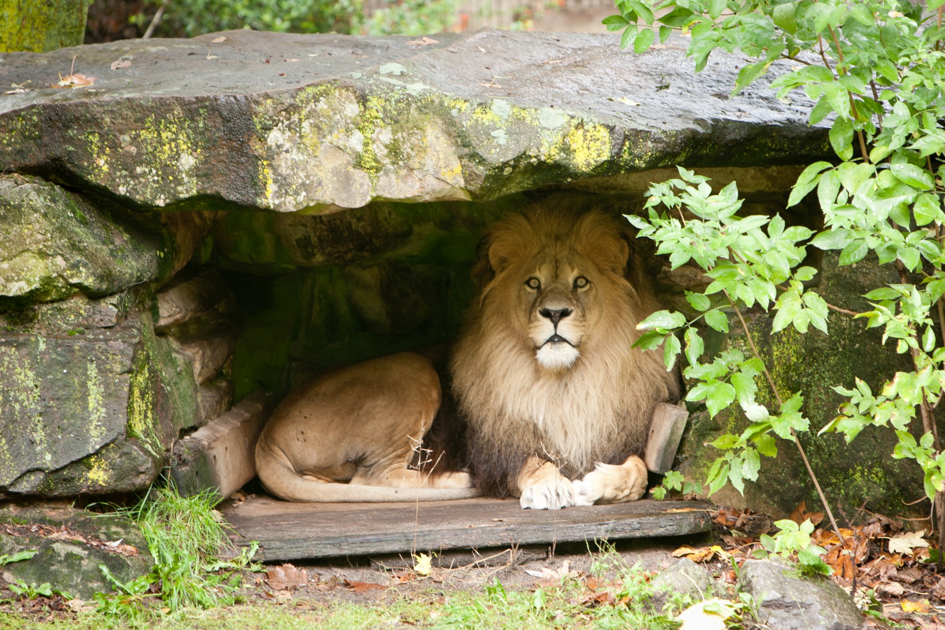 A lion with a magnificent mane lies under a stone in a cave