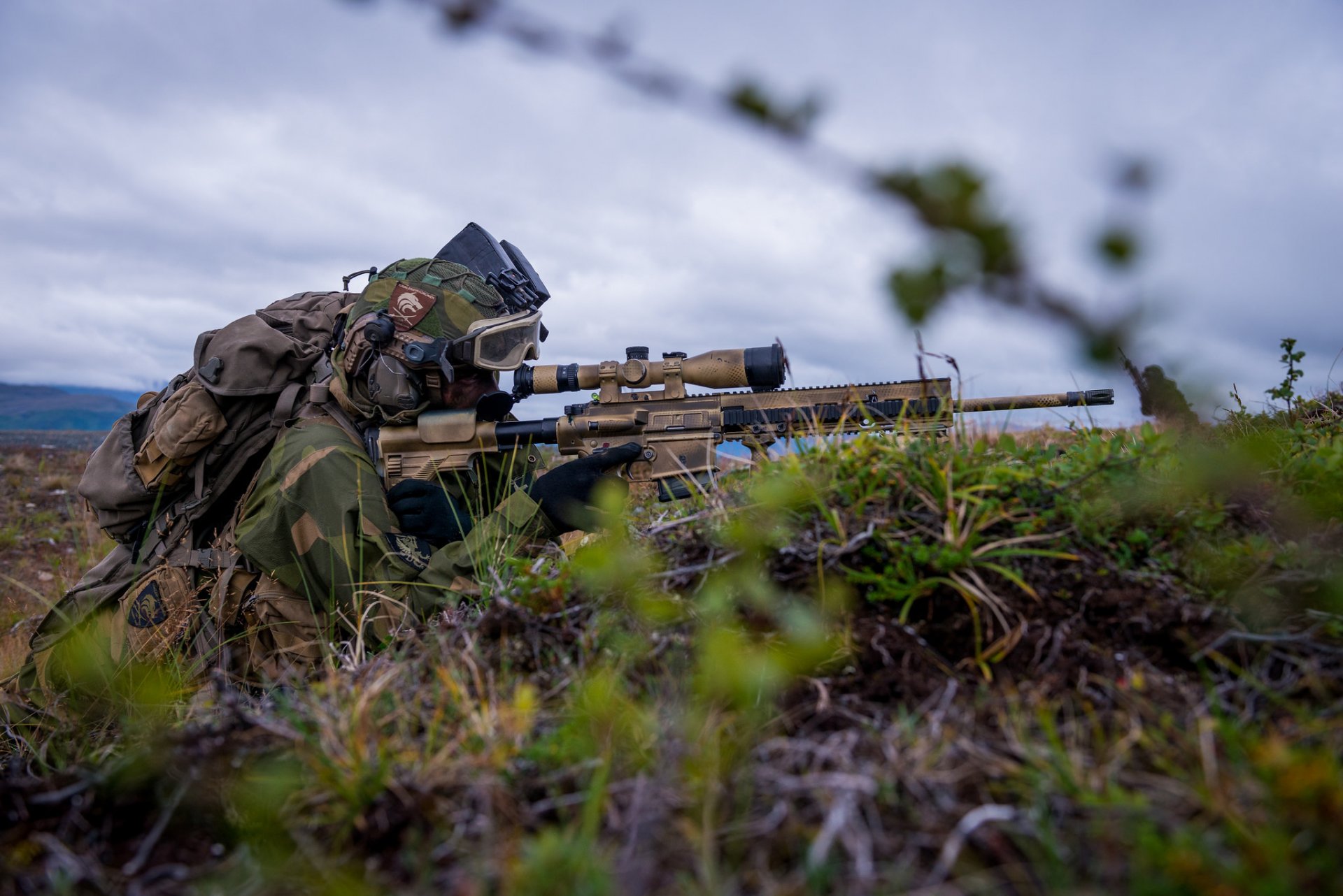 A soldier looks through the optical sight of a rifle