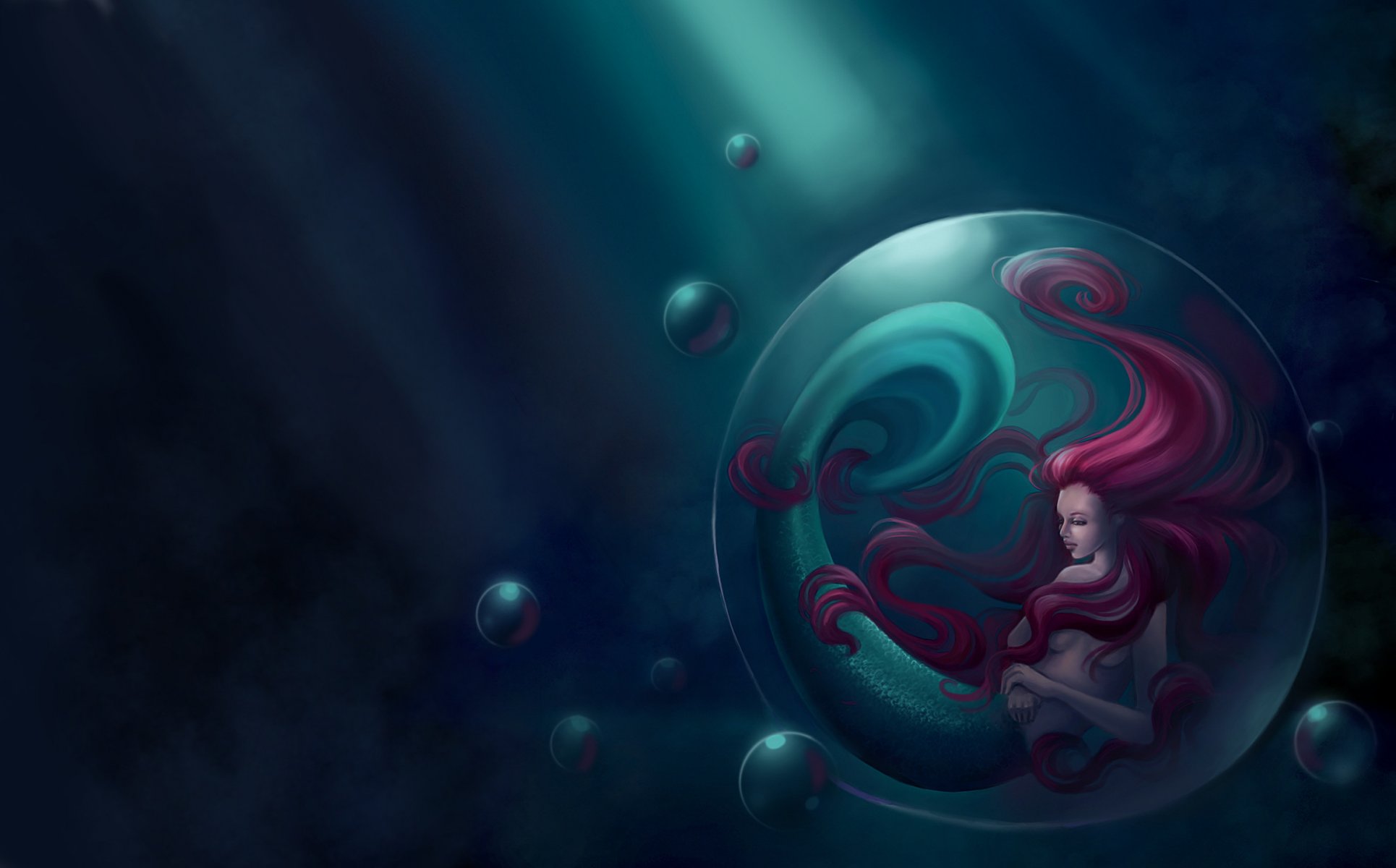 A mermaid with red hair in a bubble at the bottom of the sea
