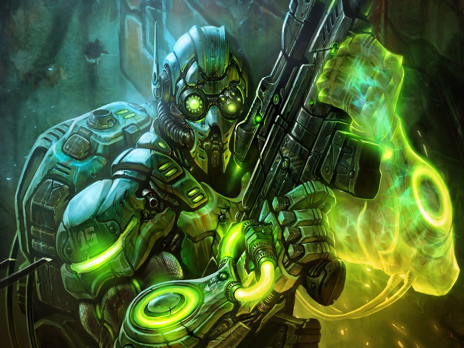 A wasteland dweller in a helmet and raincoat with a rifle