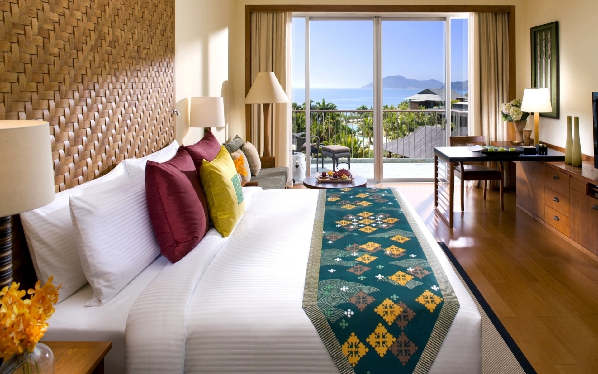 Oriental minimalism in the bedroom . Natural colors in the interior
