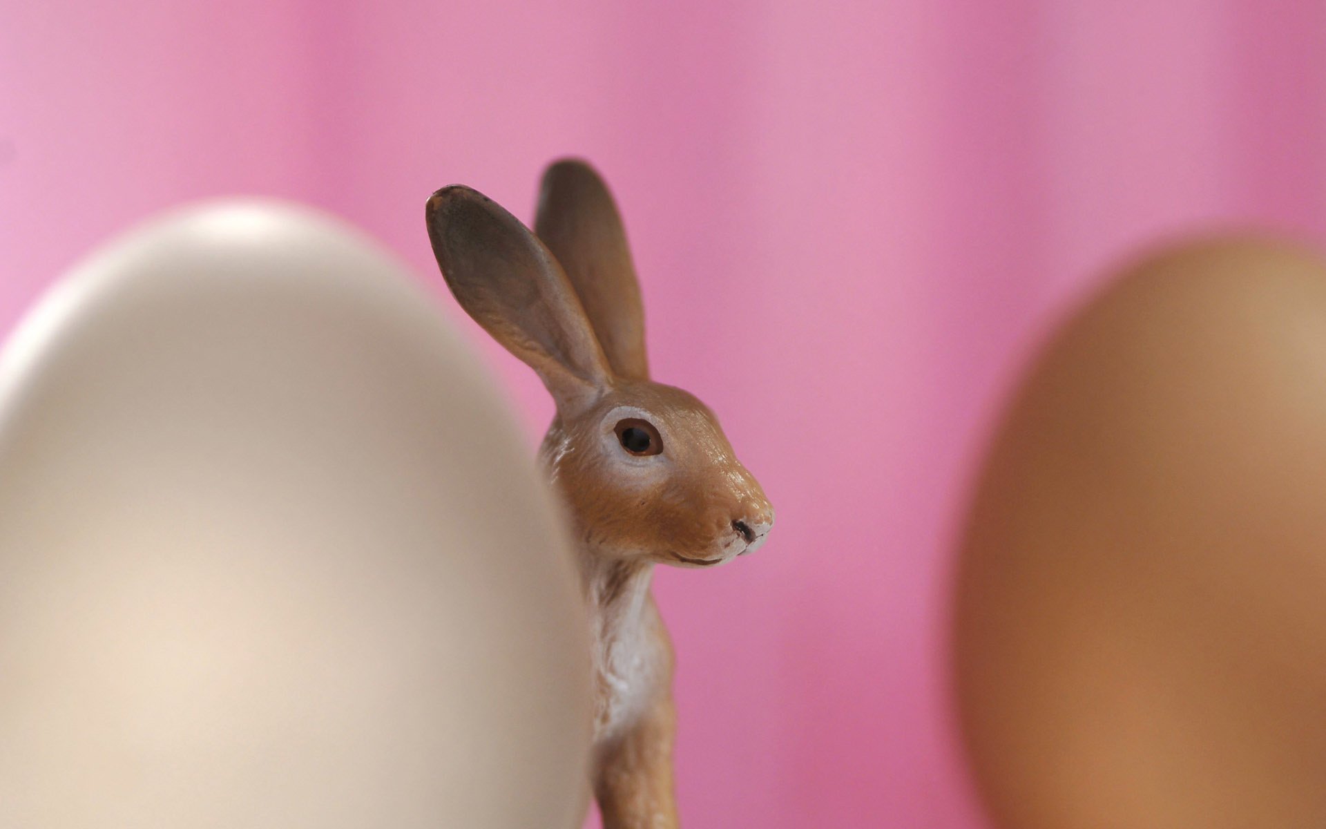 Easter bunny peeks out from behind the egg