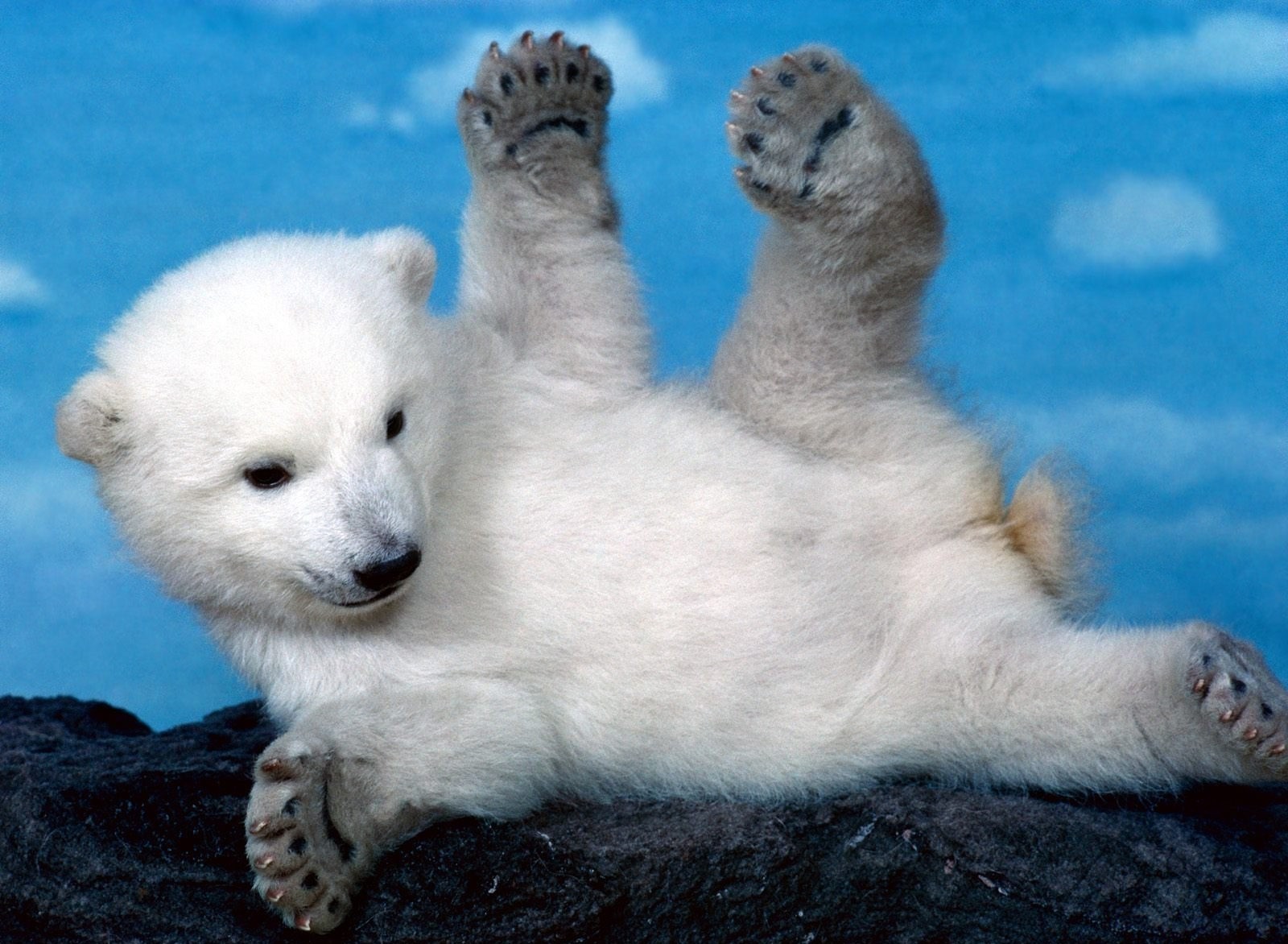 The white bear cub is lying on its side