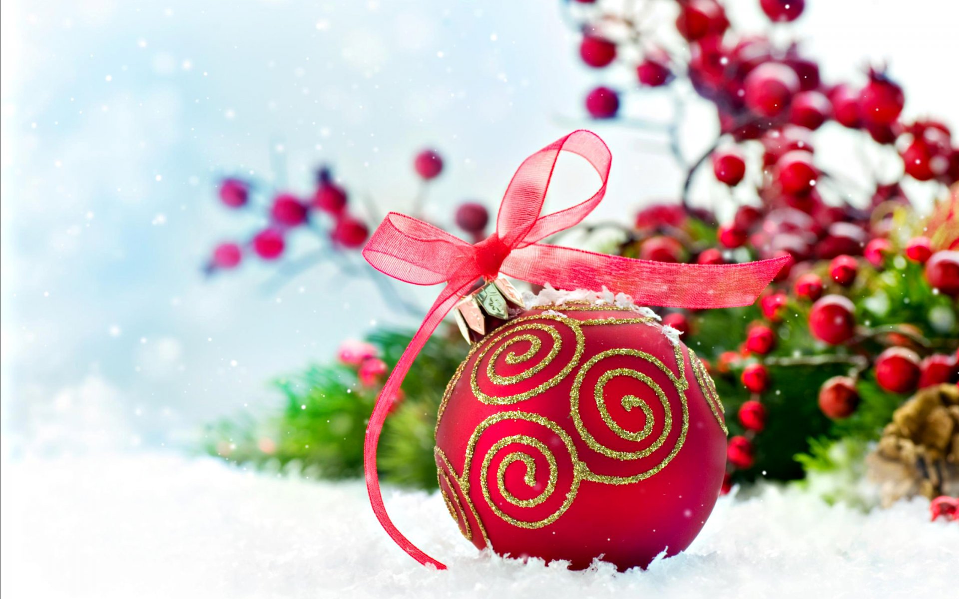 Red Christmas tree balls on a snow-covered fir branch