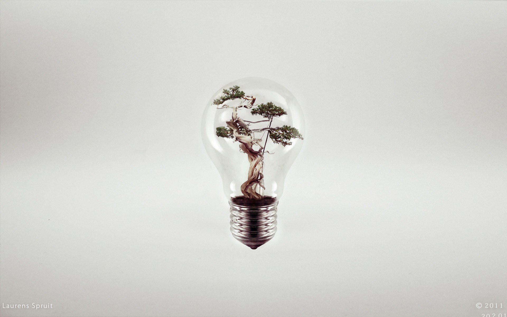 A girl with a tree head and a light bulb on a branch and a black raven on the green grass