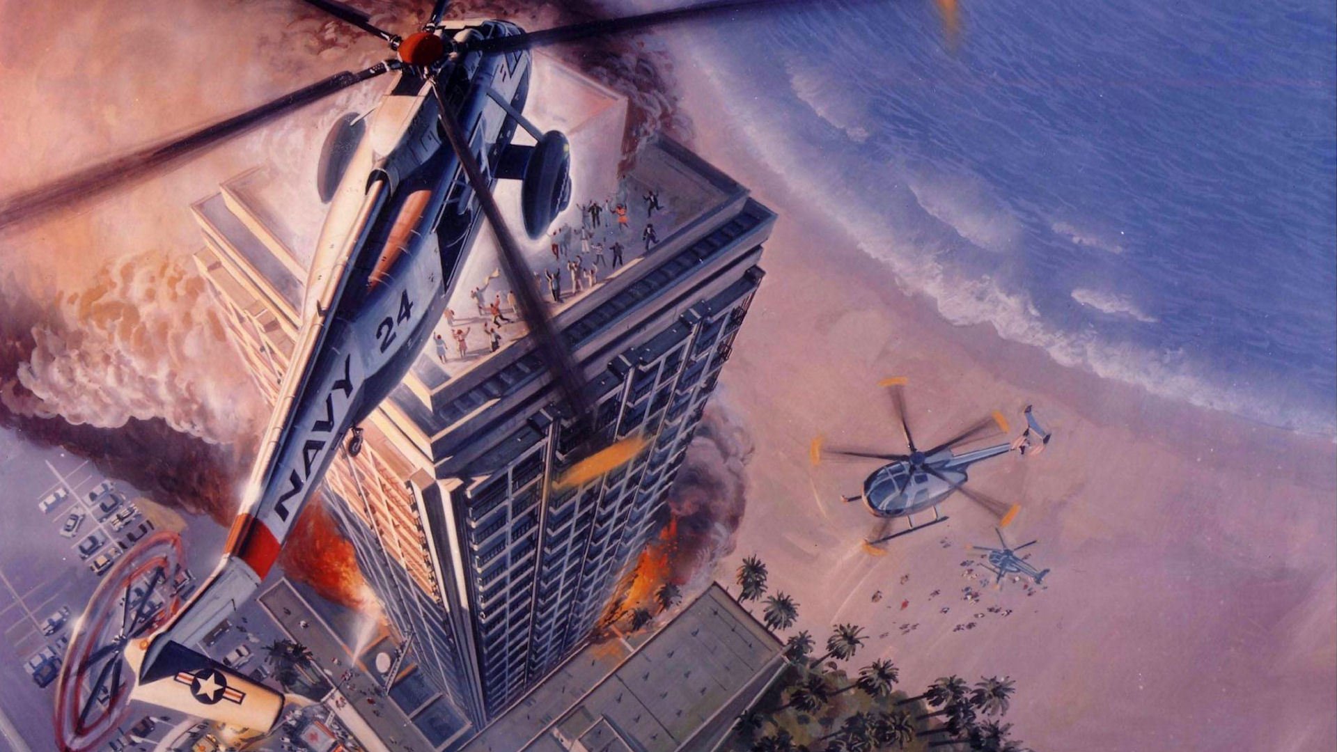 Judge Dredd stands against the backdrop of destroyed skyscrapers