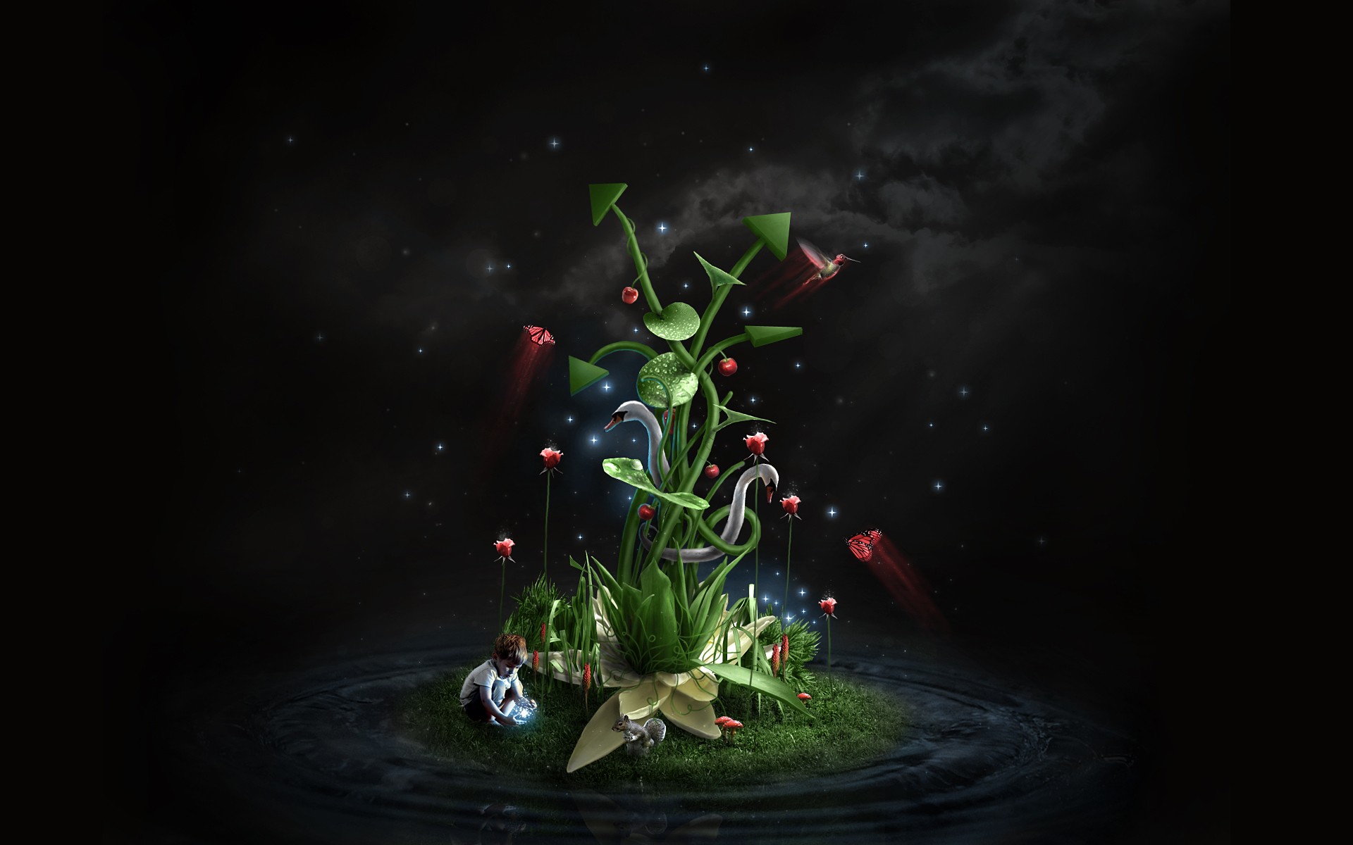 A child at flowers with fireflies, butterflies, a swan and a squirrel