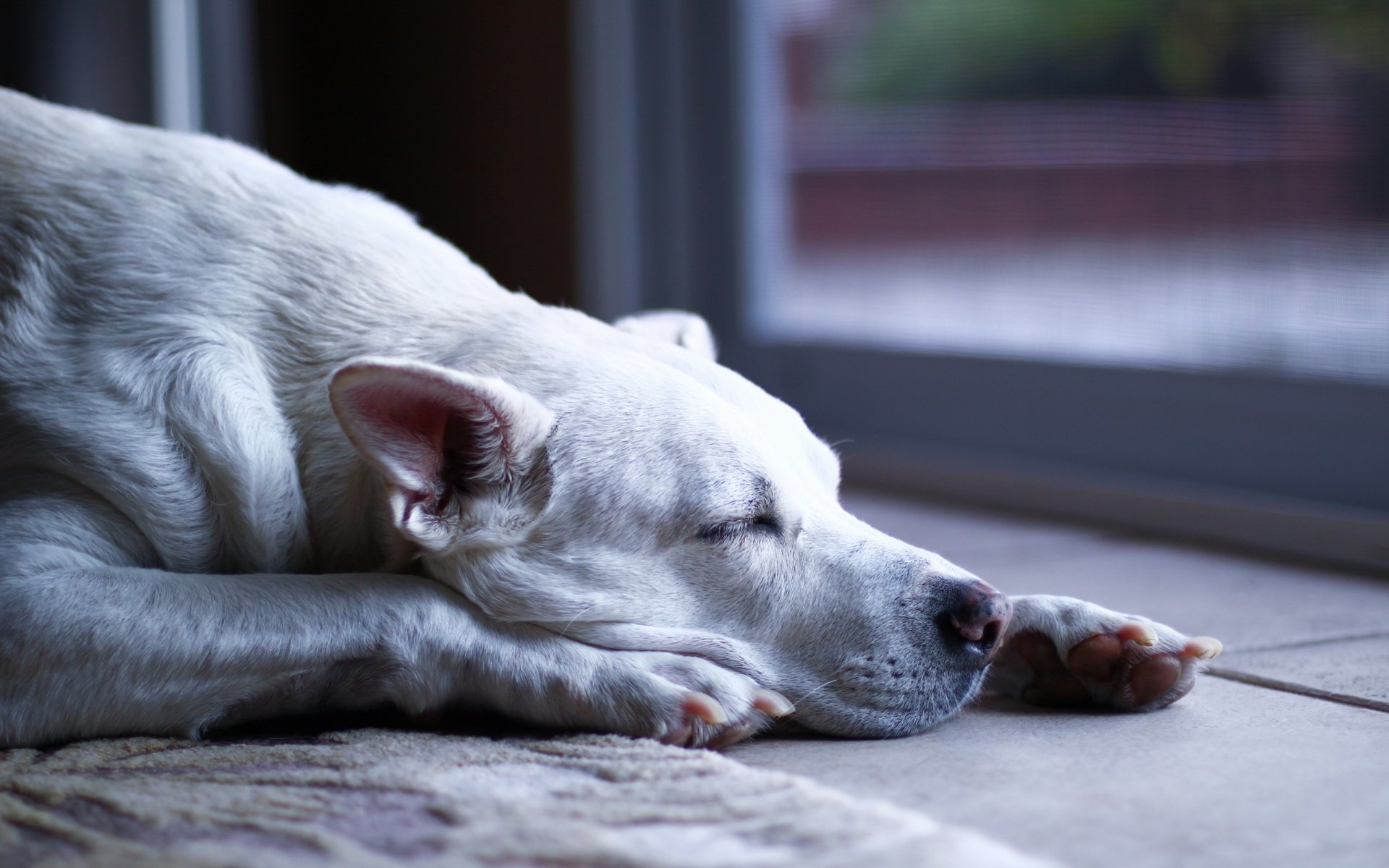 Spotted Dolmatian Great Dane lies on a white fluffy carpet in the living room